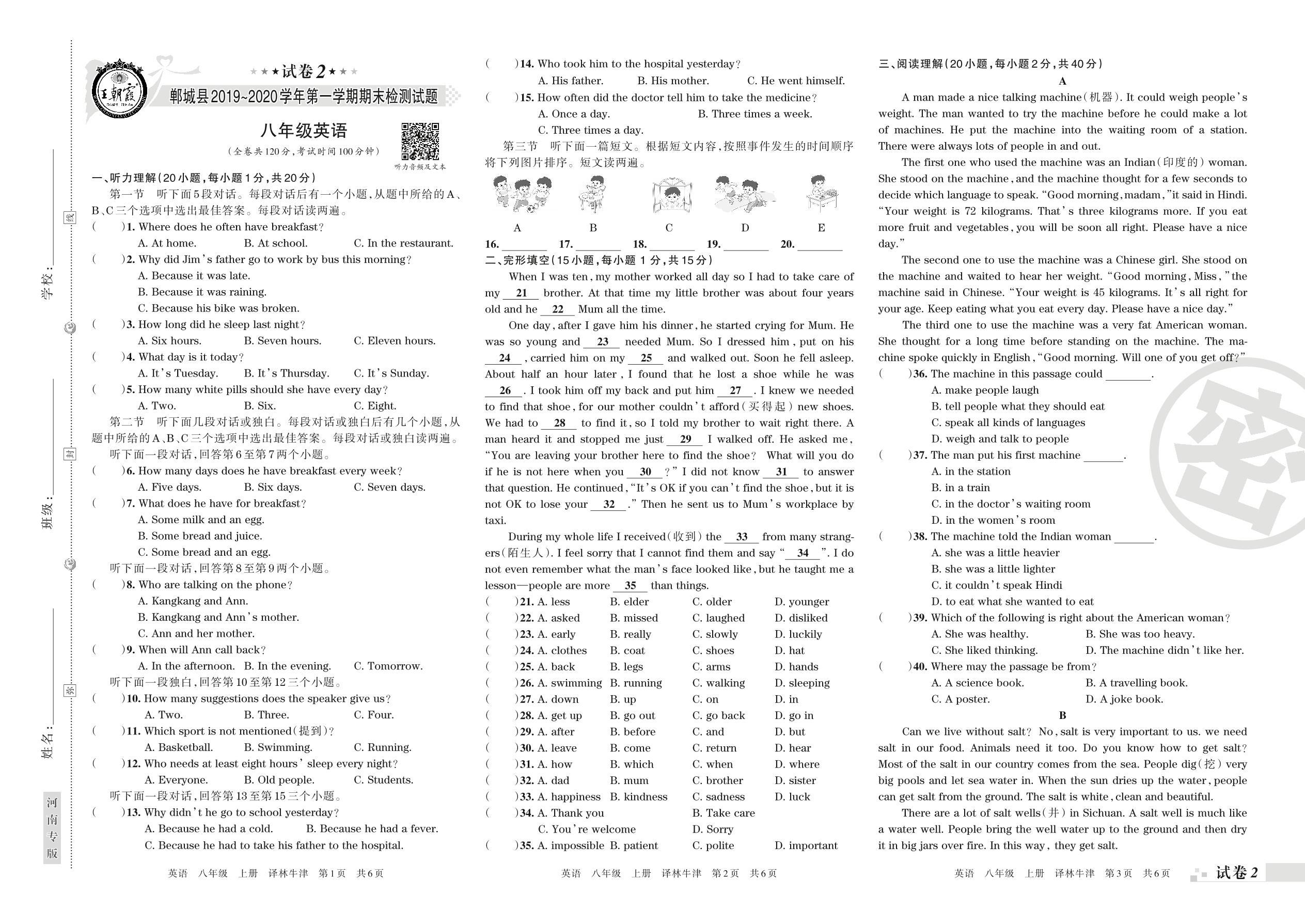 2019-2020学年第一学期周口市郸城县八年级英语试卷(译林版)【2】
