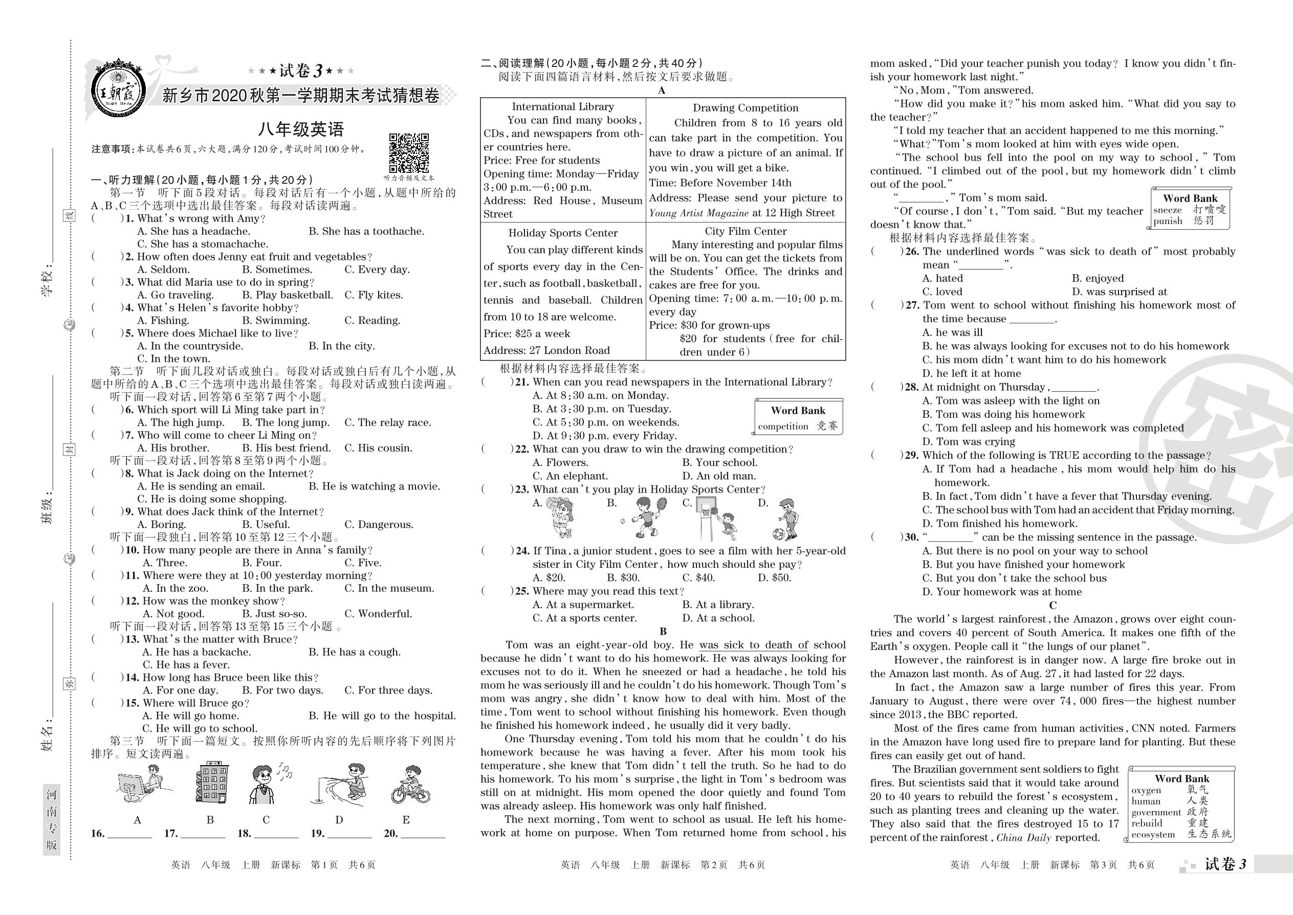 2019-2020学年第一学期新乡市猜想卷八年级英语试卷(新课版)【3】