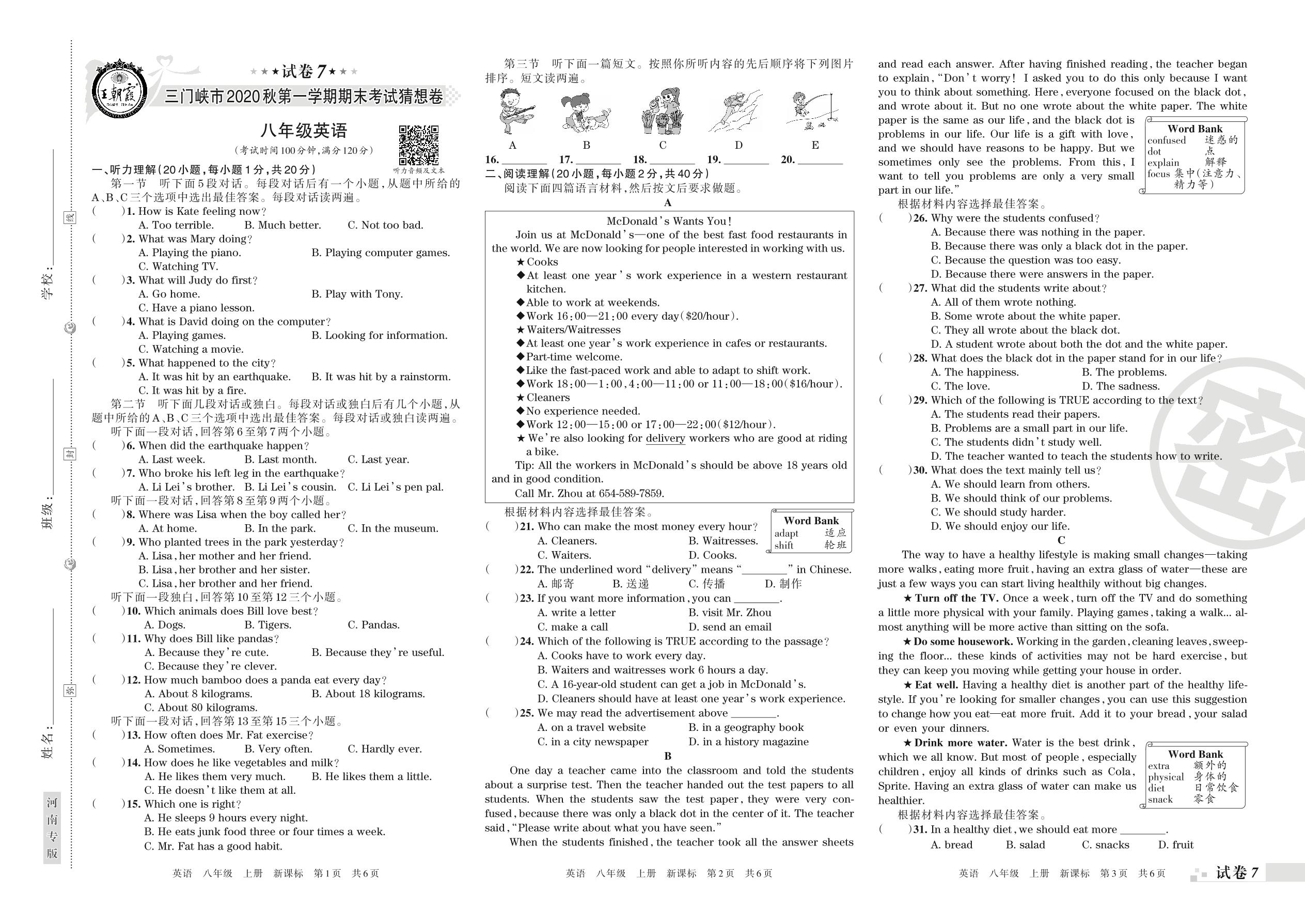 2019-2020学年第一学期三门峡市猜想卷八年级英语试卷(新课版)【7】