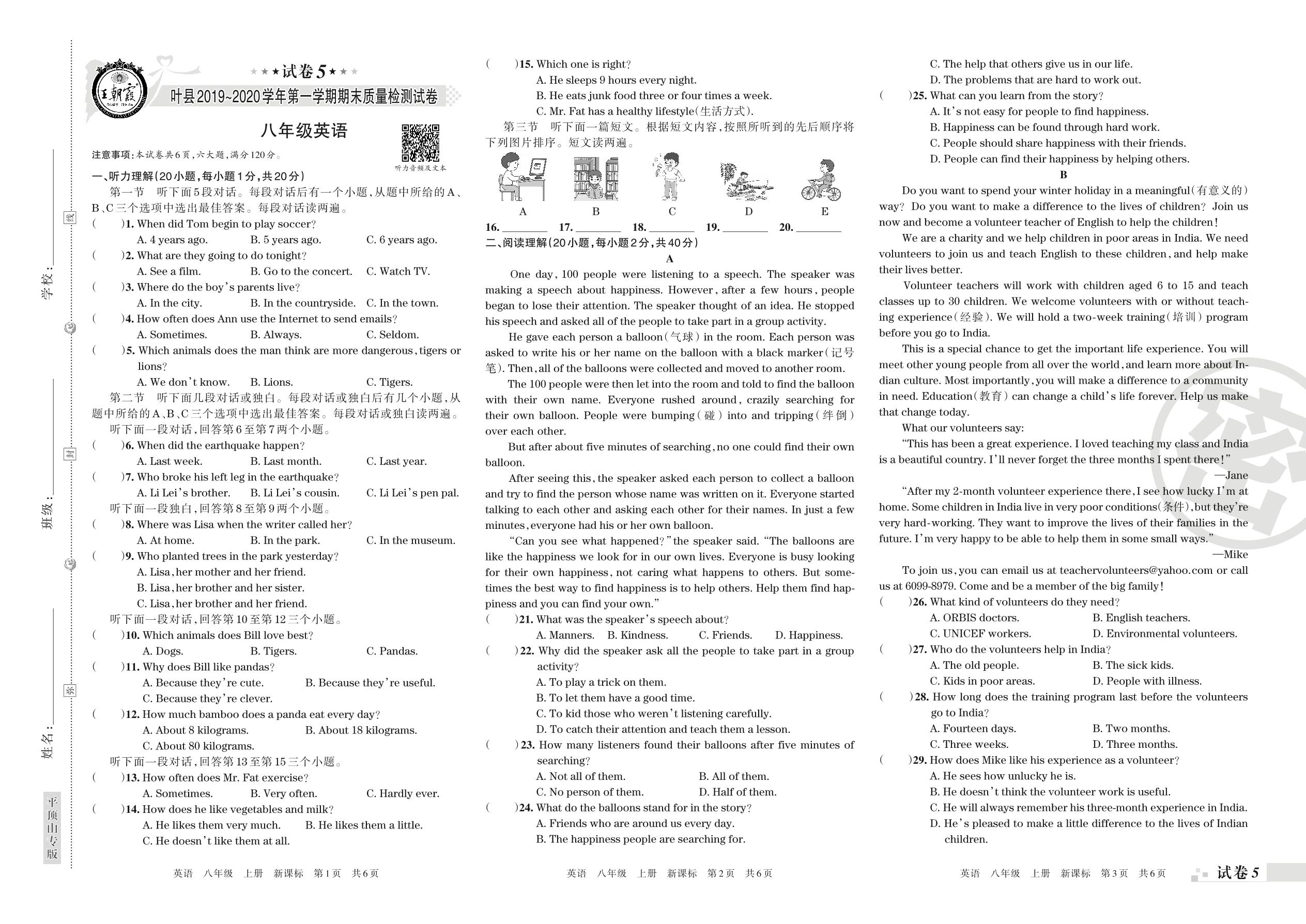 2019-2020学年第一学期平顶山市叶县八年级英语试卷(新课版)【5】