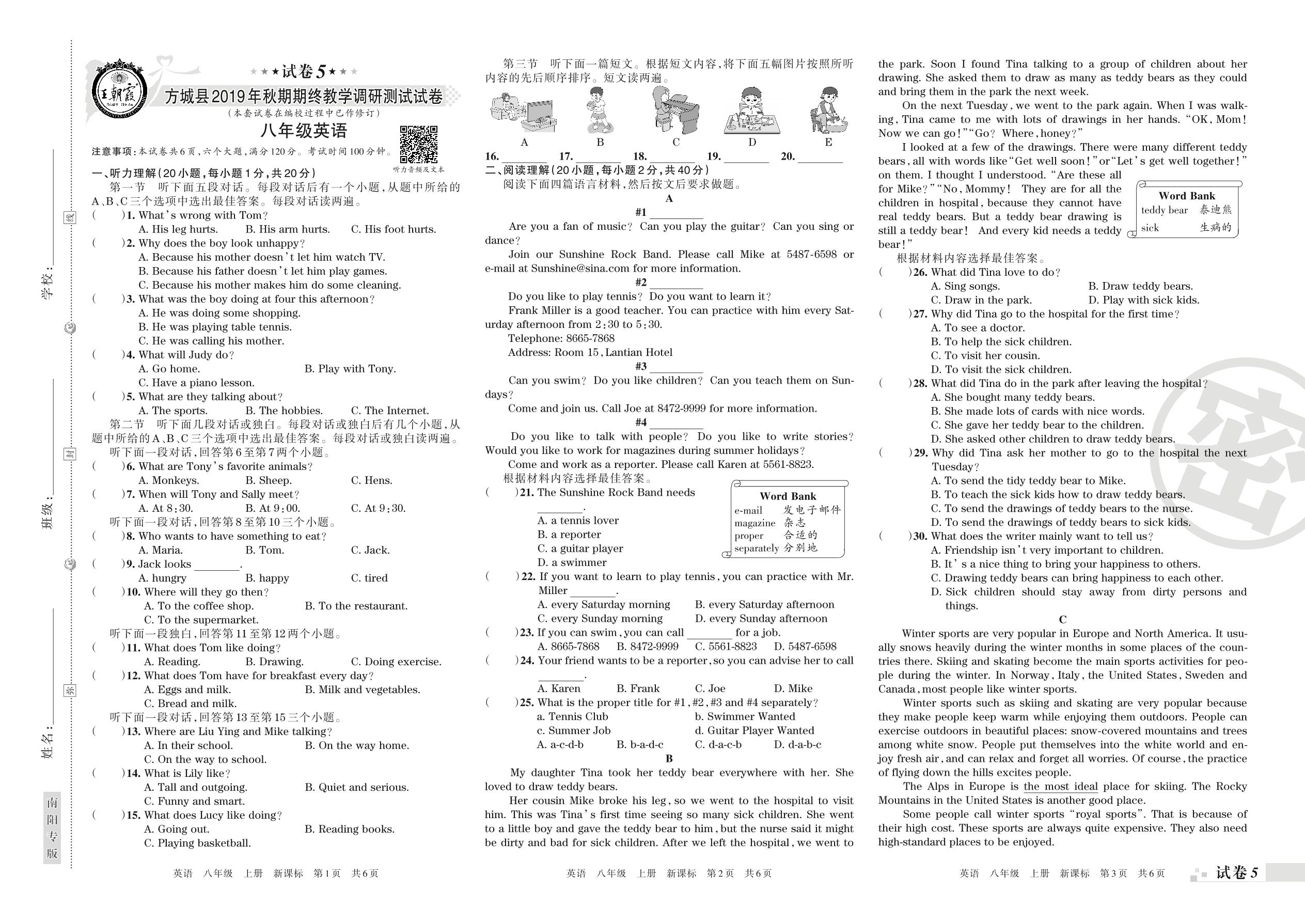 2019-2020学年第一学期南阳市方城县八年级英语试卷(新课版)【5】