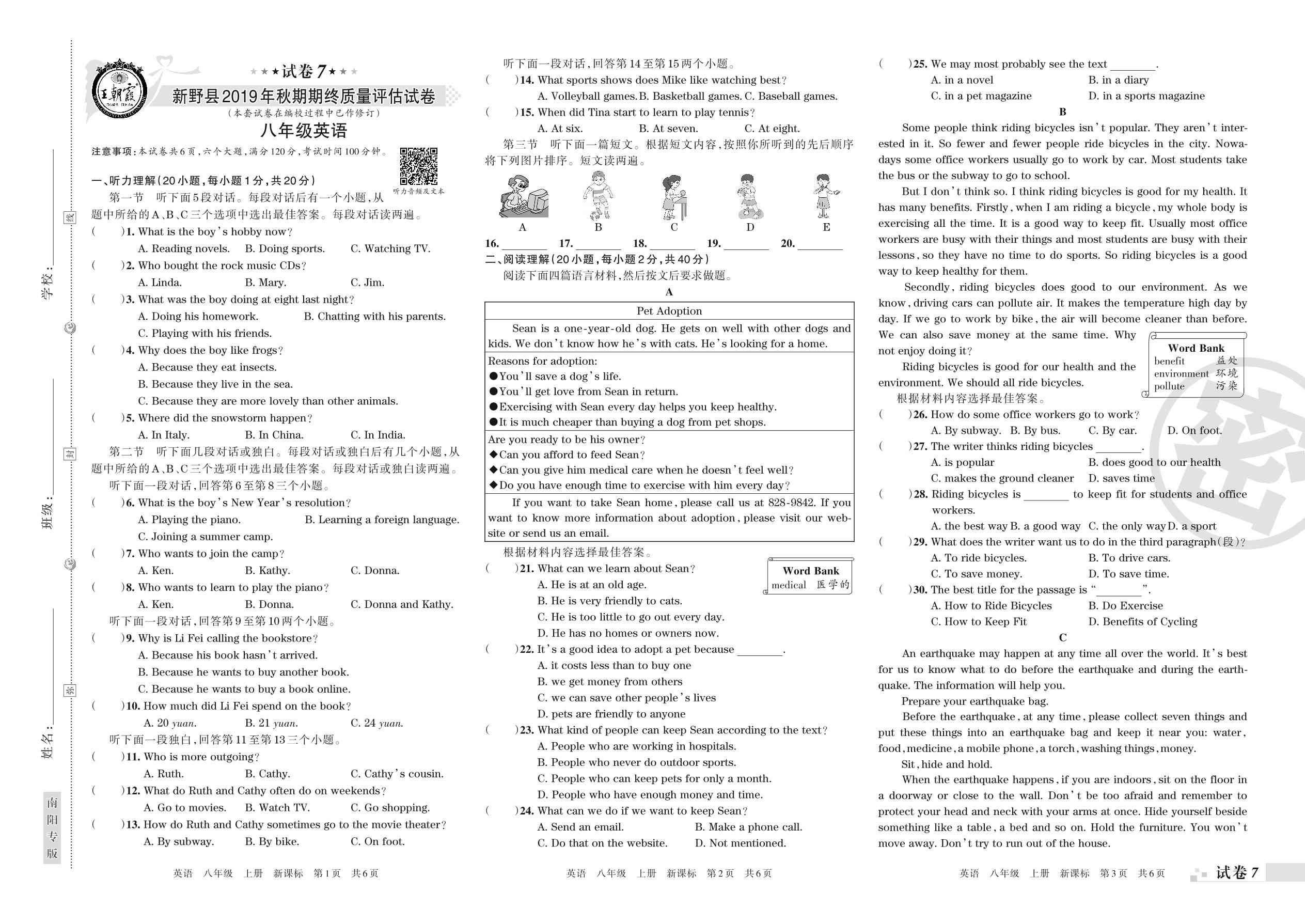 2019-2020学年第一学期南阳市新野县八年级英语试卷(新课版)【7】