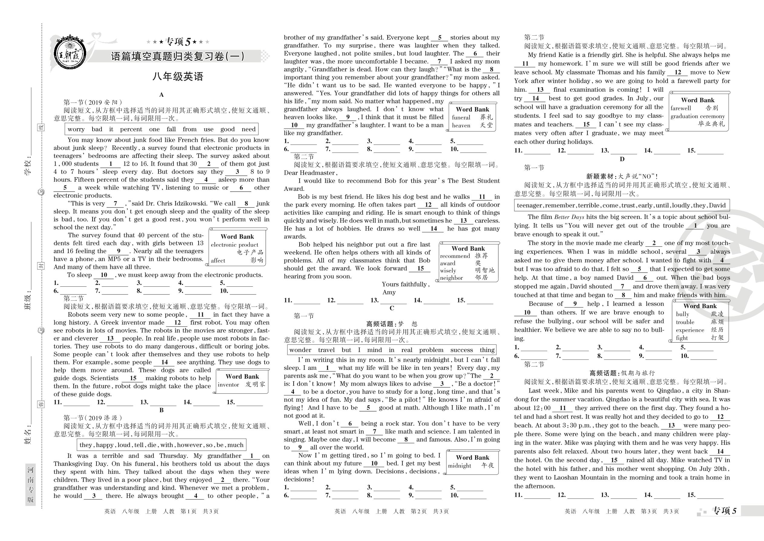 王朝霞期末专项卷——语篇填空真题归类复习八年级上册英语(人教版)【0】