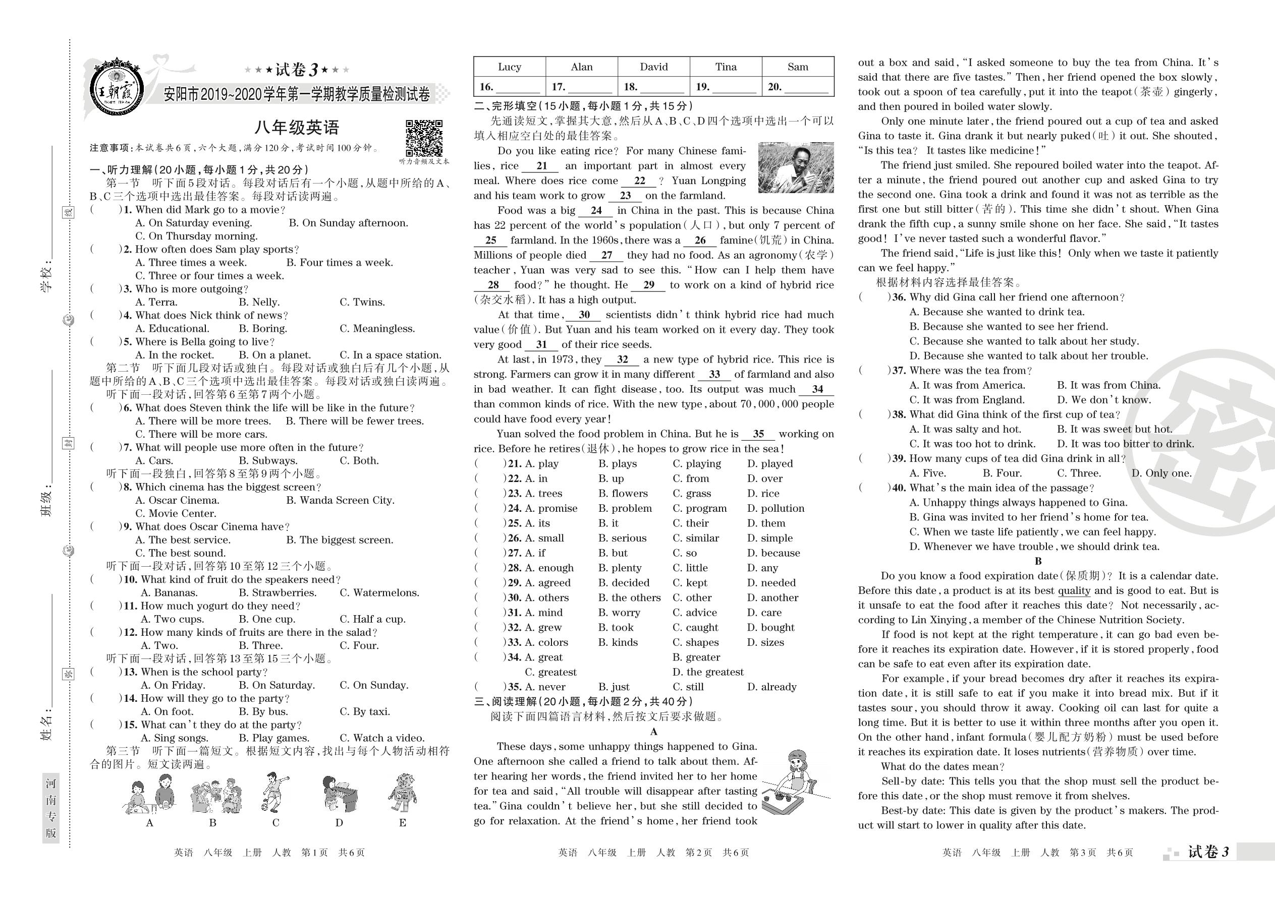 2019-2020学年第一学期安阳市八年级英语试卷(人教版)【3】