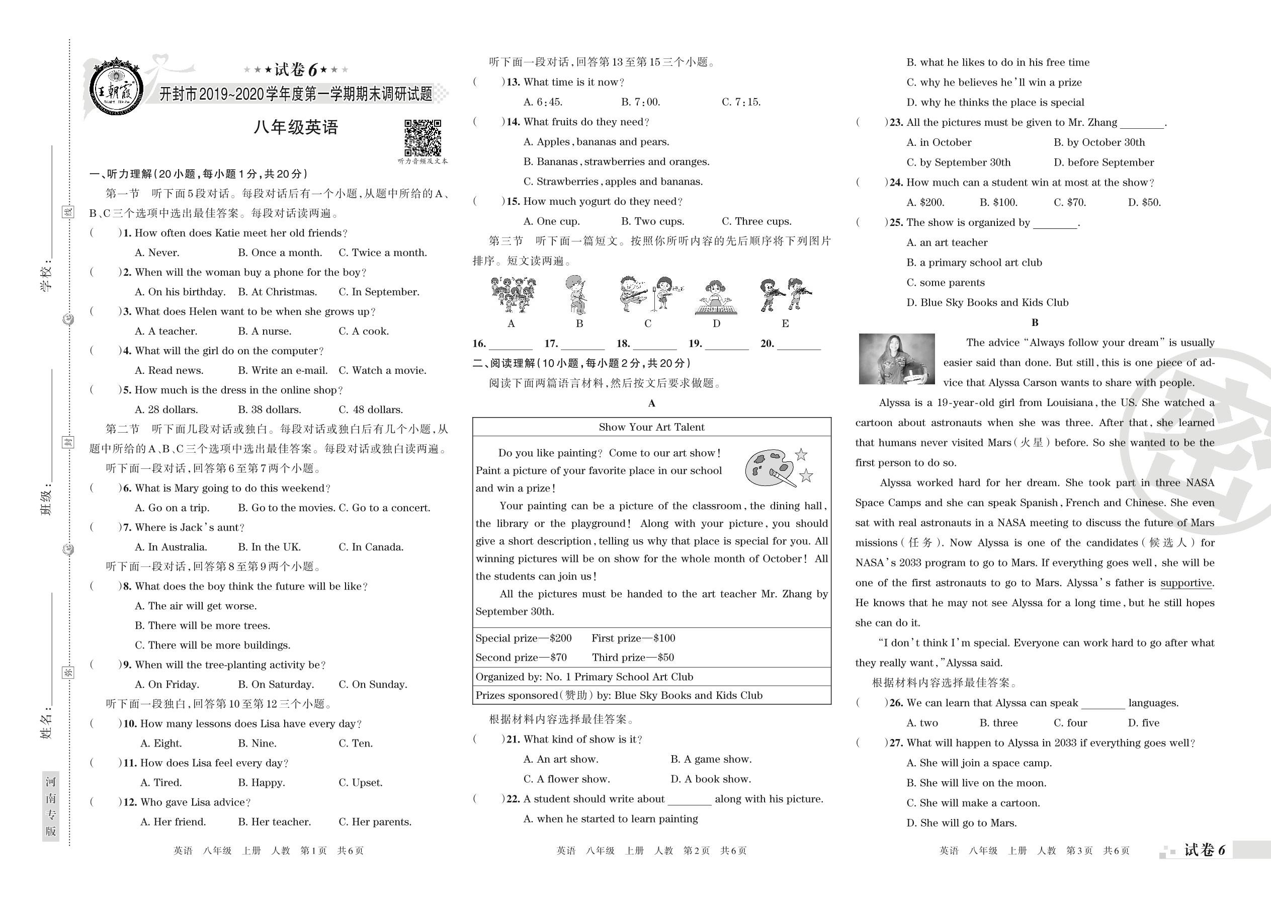 2019-2020学年第一学期开封市八年级英语试卷(人教版)【6】