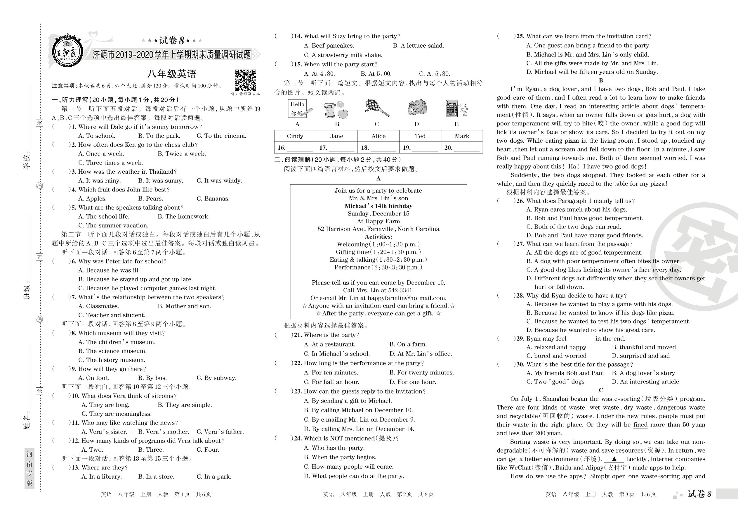 2019-2020学年第一学期济源市八年级英语试卷(人教版)【8】