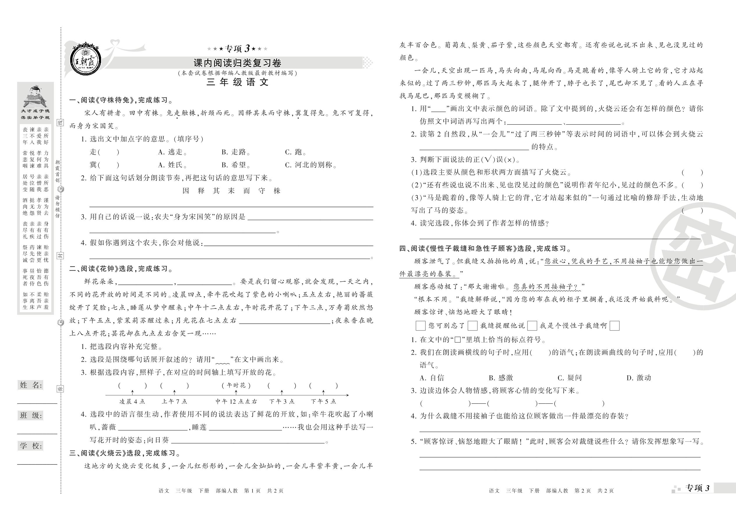 王朝霞期末专项卷——课内阅读、课外阅读真题归类复习卷三年级下册语文(人教版)_R21080190936【0】