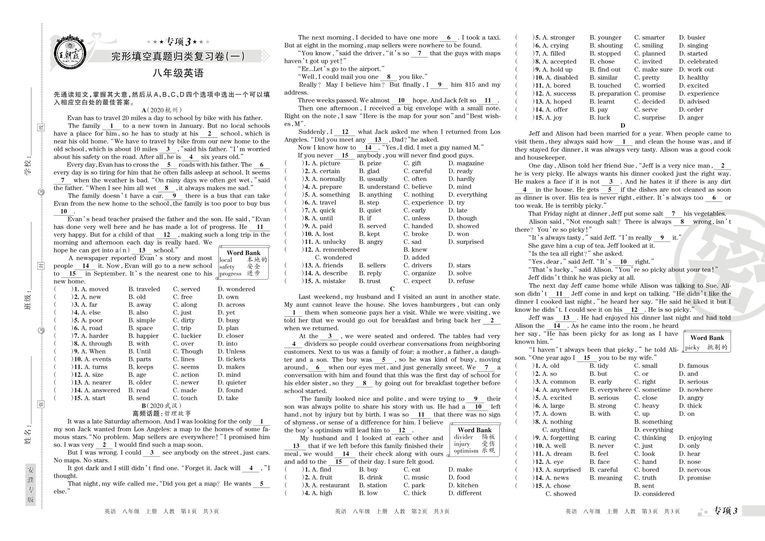 王朝霞期末专项卷——完形填空真题归类复习八年级上册英语(人教版)