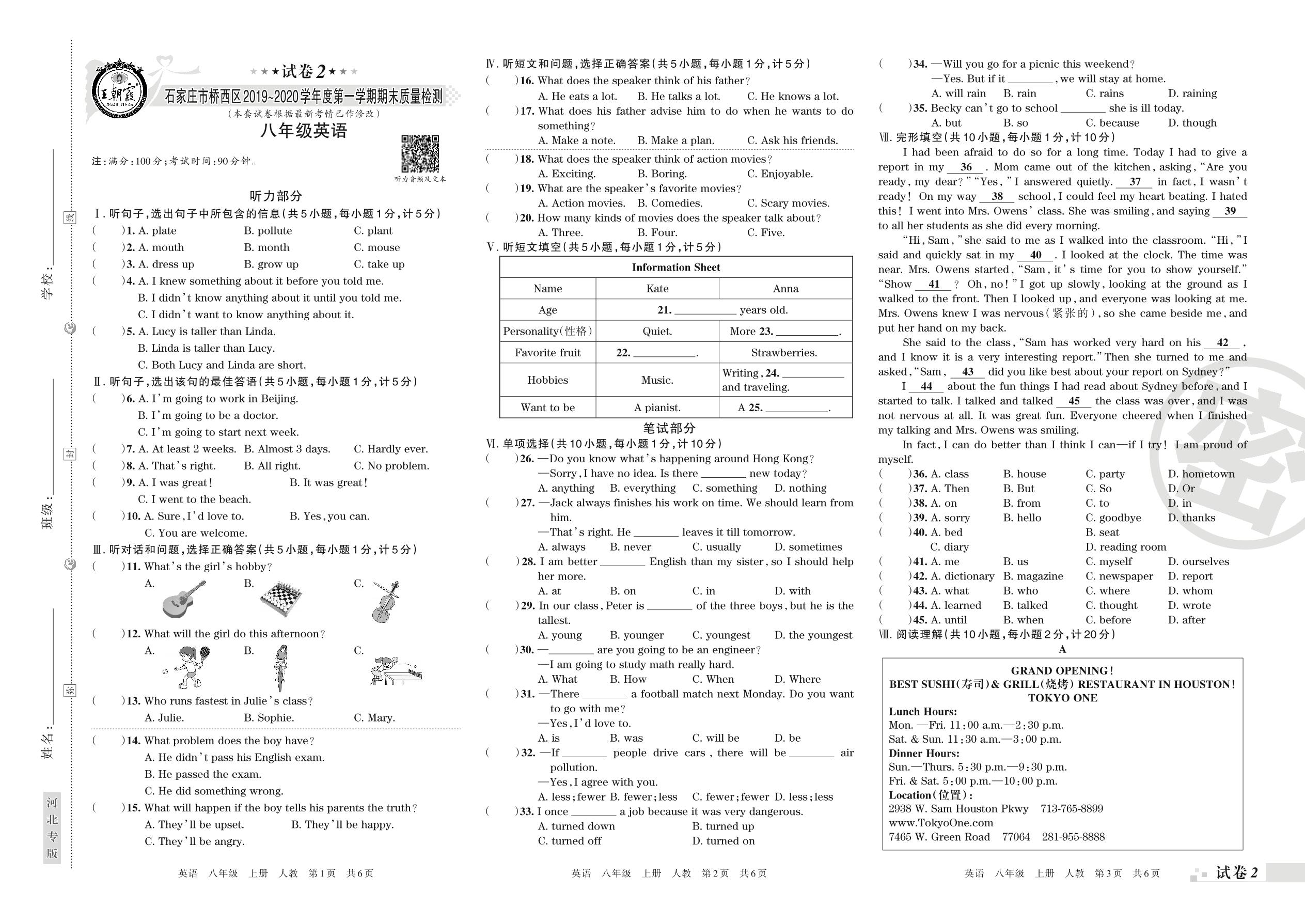 2019-2020学年第一学期石家庄市桥西区八年级英语试卷(人教版)【2】