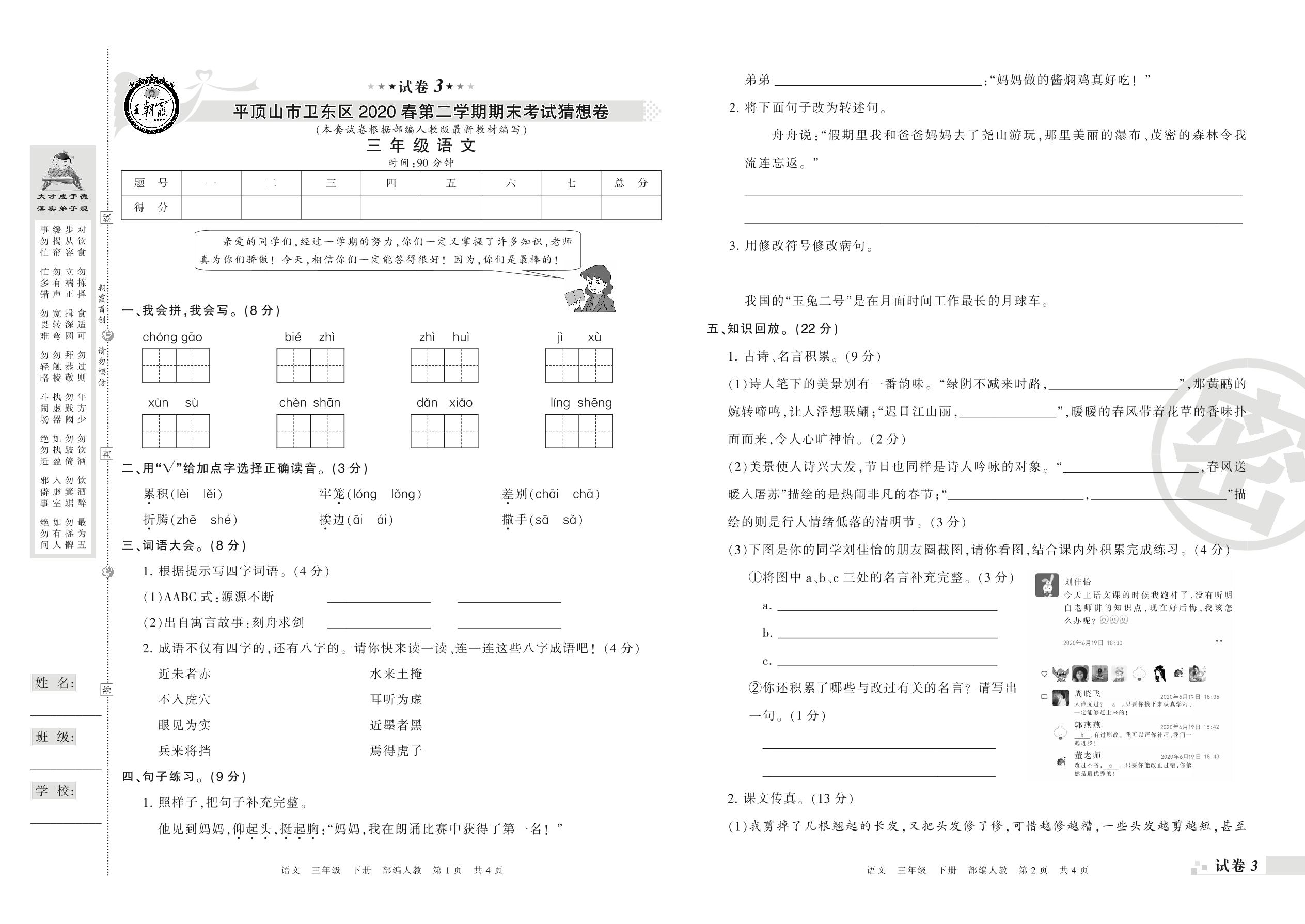 三年级语文人教版下册期末卷