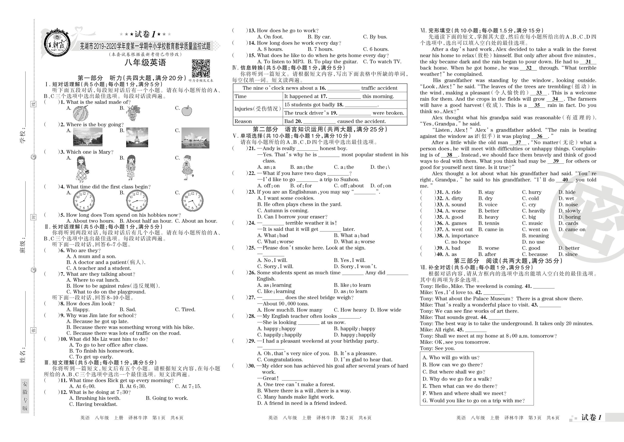 2019-2020学年第一学期芜湖市八年级英语试卷(译林版)【1】