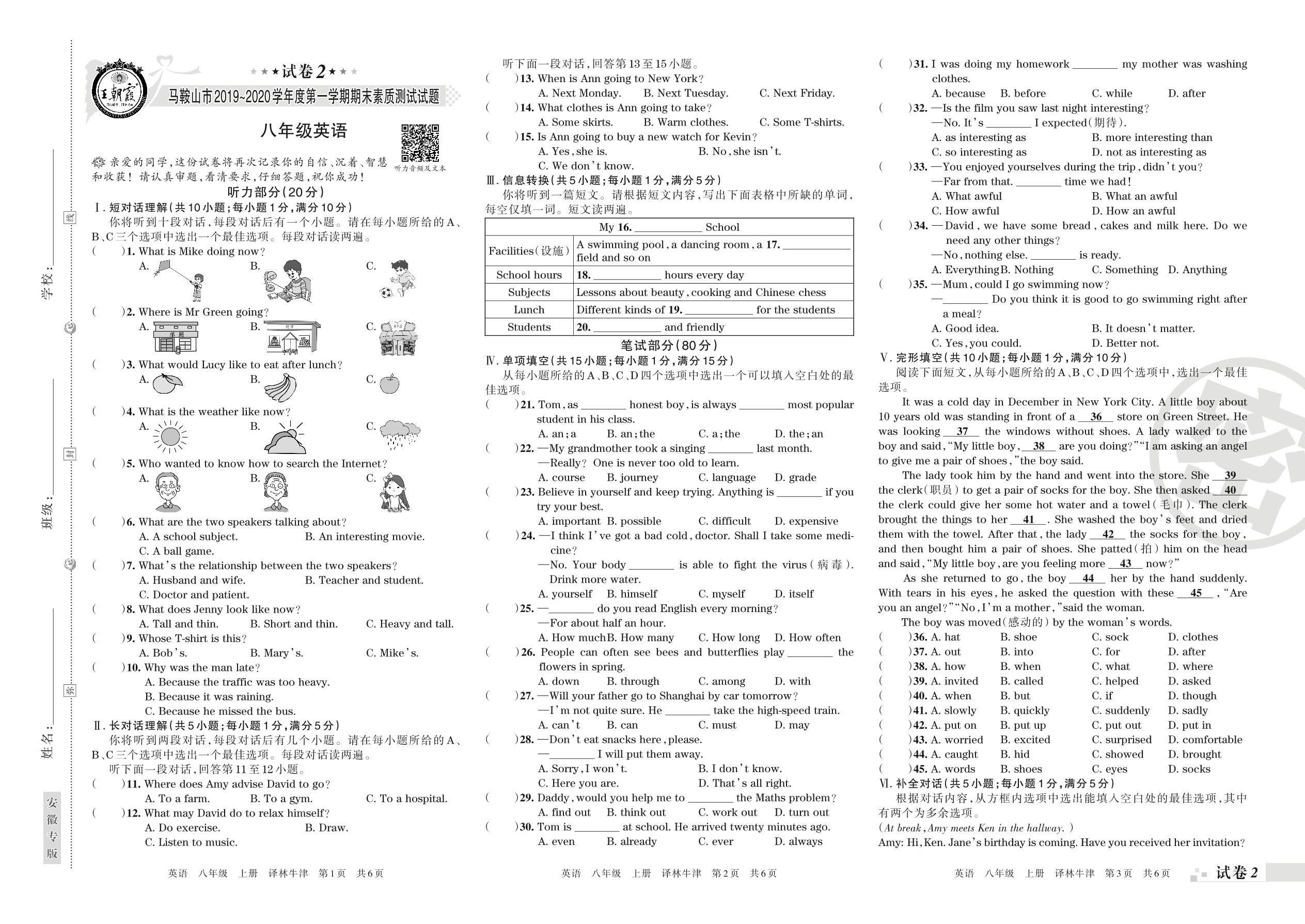 2019-2020学年第一学期马鞍山市八年级英语试卷(译林版)【2】