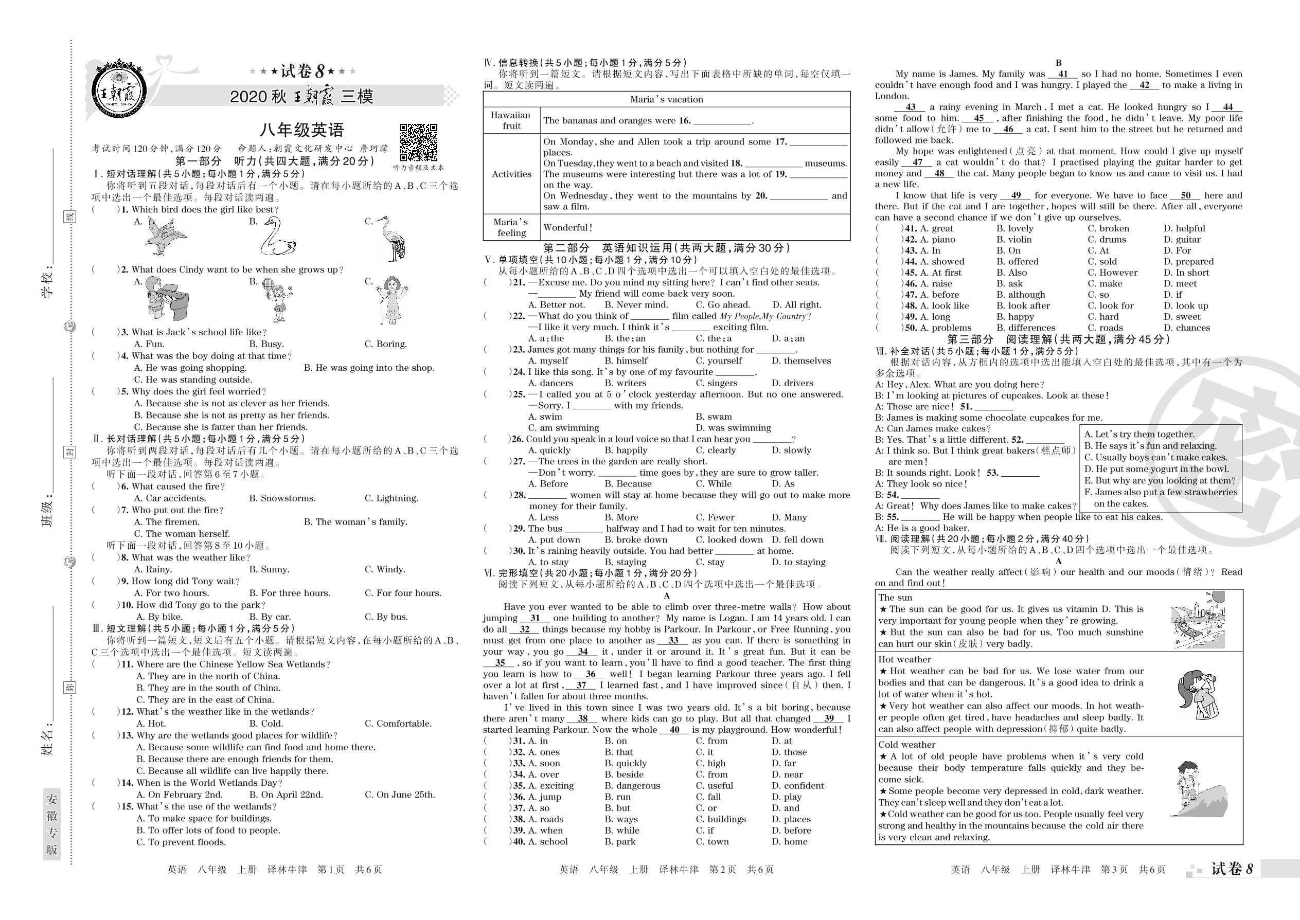 八年级英语译林版(译林牛津版)上册期末卷