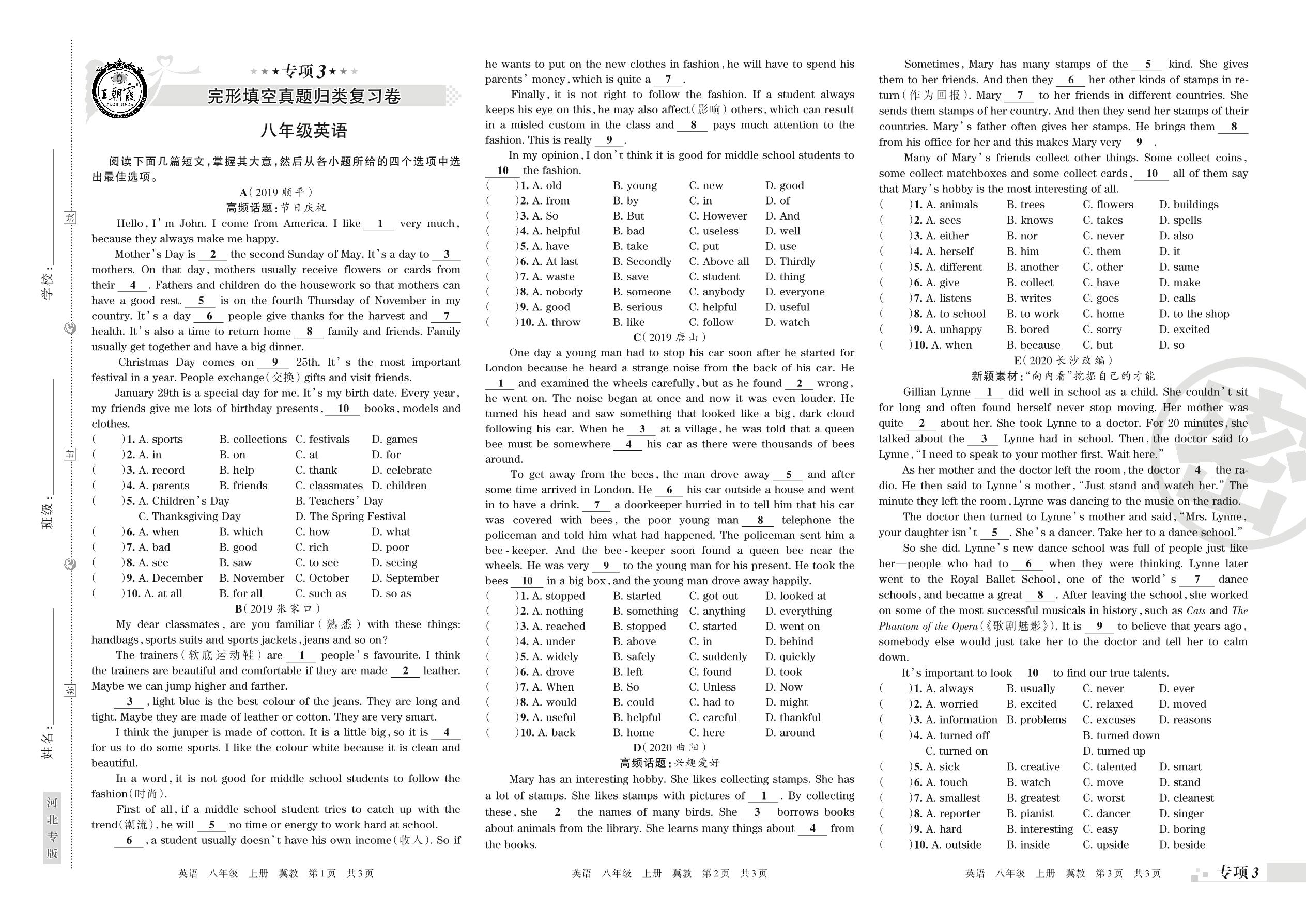 王朝霞期末专项卷——完形填空、阅读理解真题归类复习八年级上册英语(冀教版)【0】