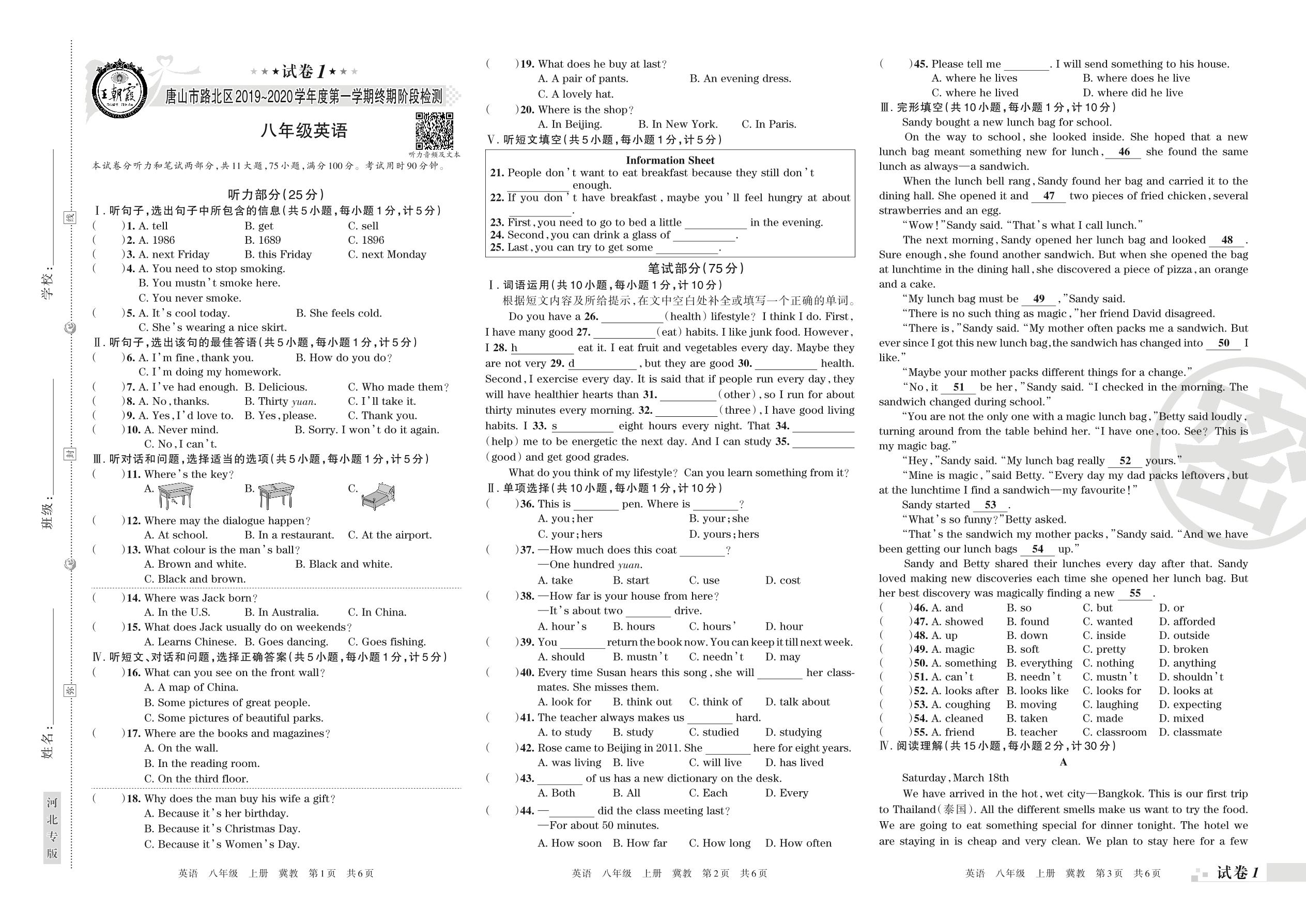 2019-2020学年第一学期唐山市路北区八年级英语试卷(冀教版)【1】