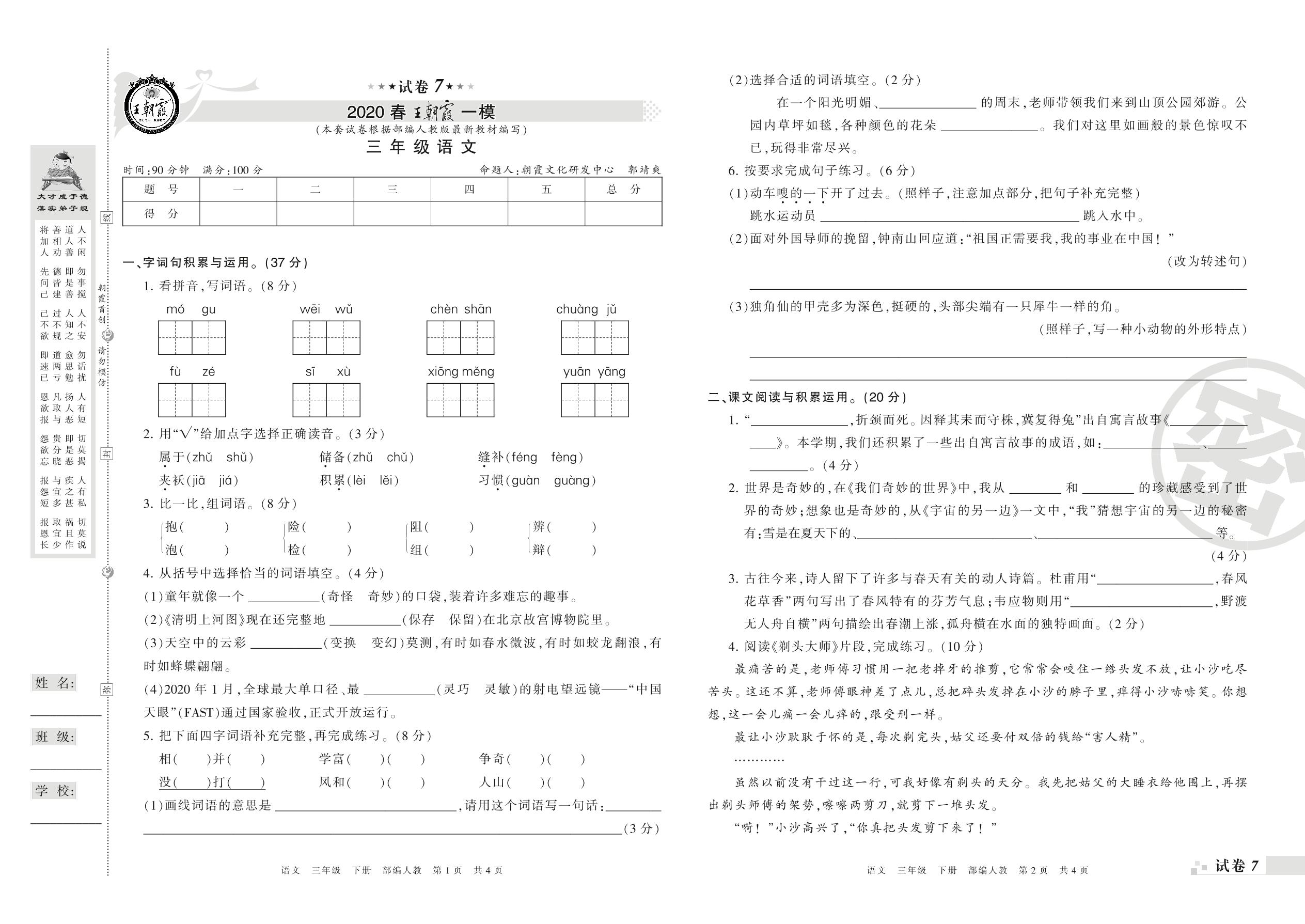 王朝霞期末模拟卷三年级下册语文(人教版)_R21080191002【7】