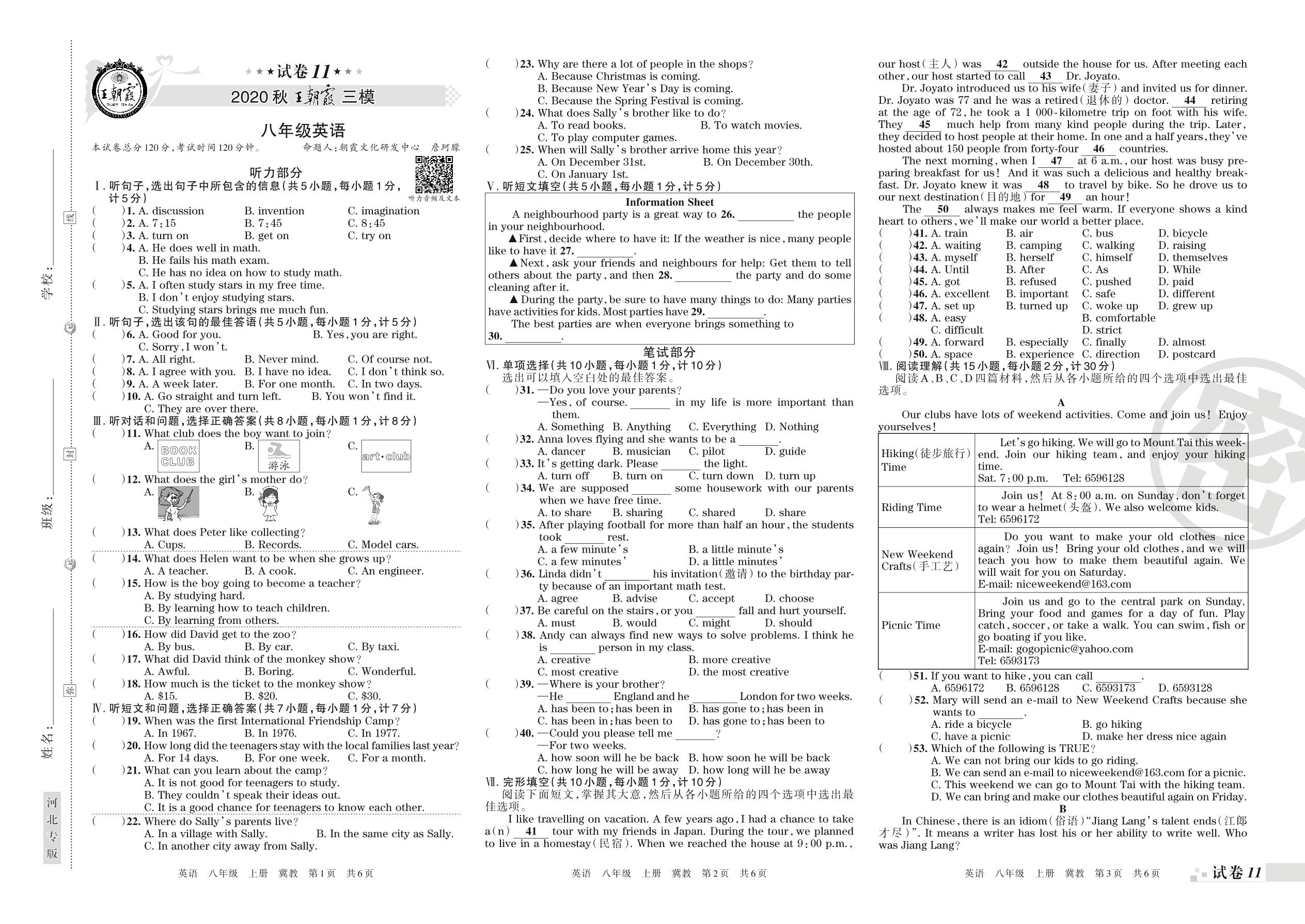 八年级英语冀教版上册期末卷