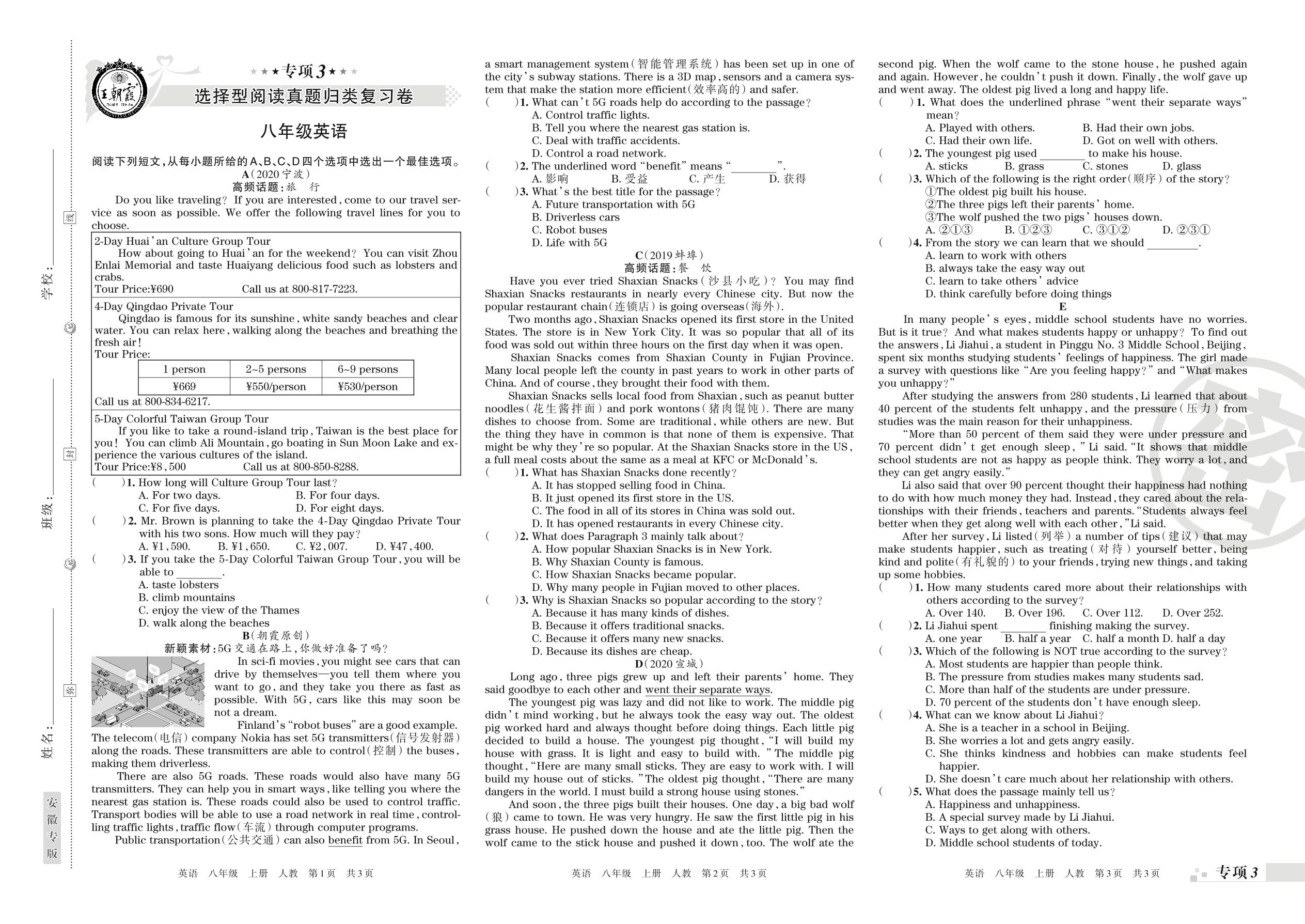 王朝霞期末专项卷——选择型阅读、任务型阅读真题归类复习八年级上册英语(人教版)
