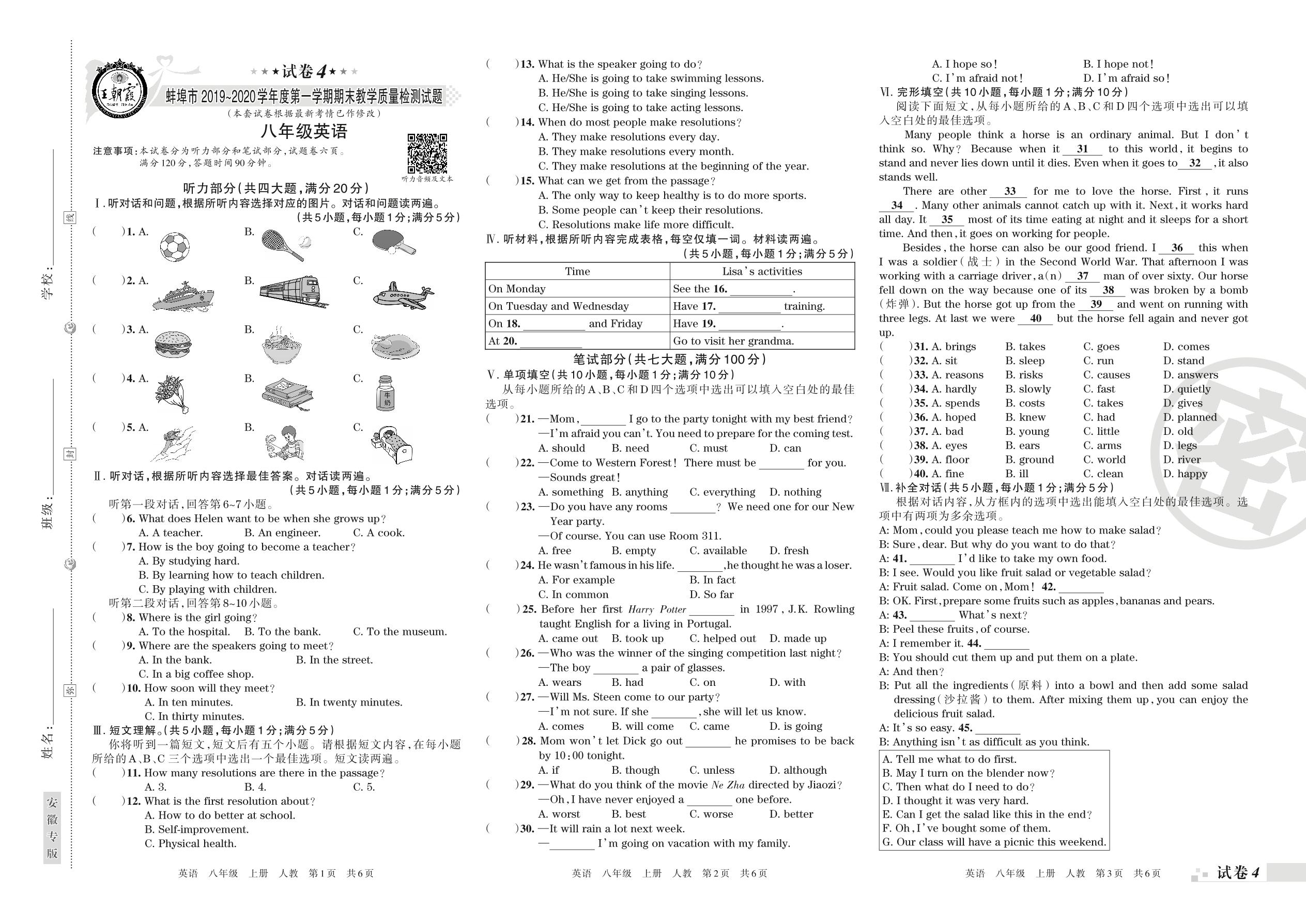 2019-2020学年第一学期蚌埠市八年级英语试卷(人教版)【4】