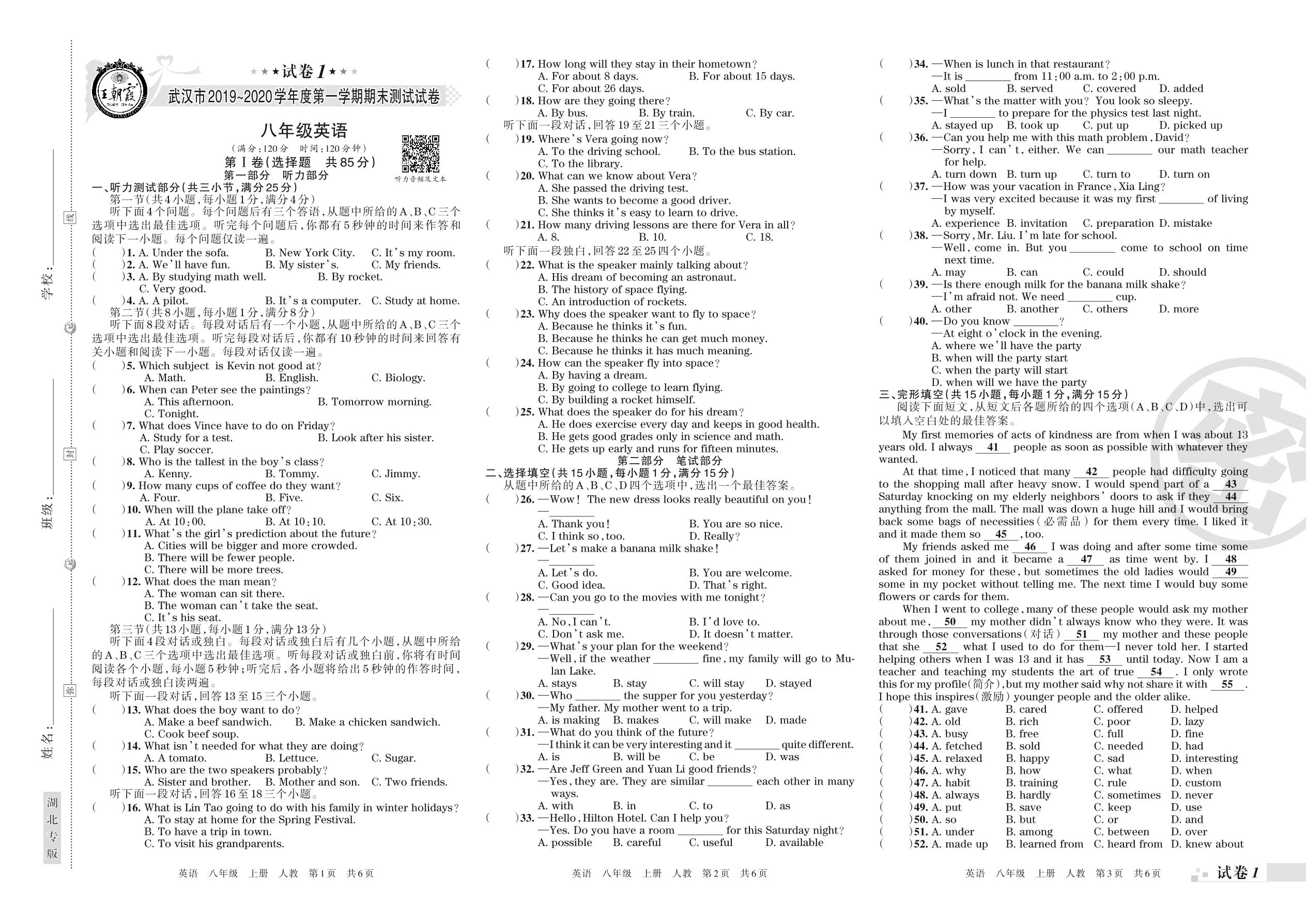 2019-2020学年第一学期武汉市八年级英语试卷(人教版)【1】