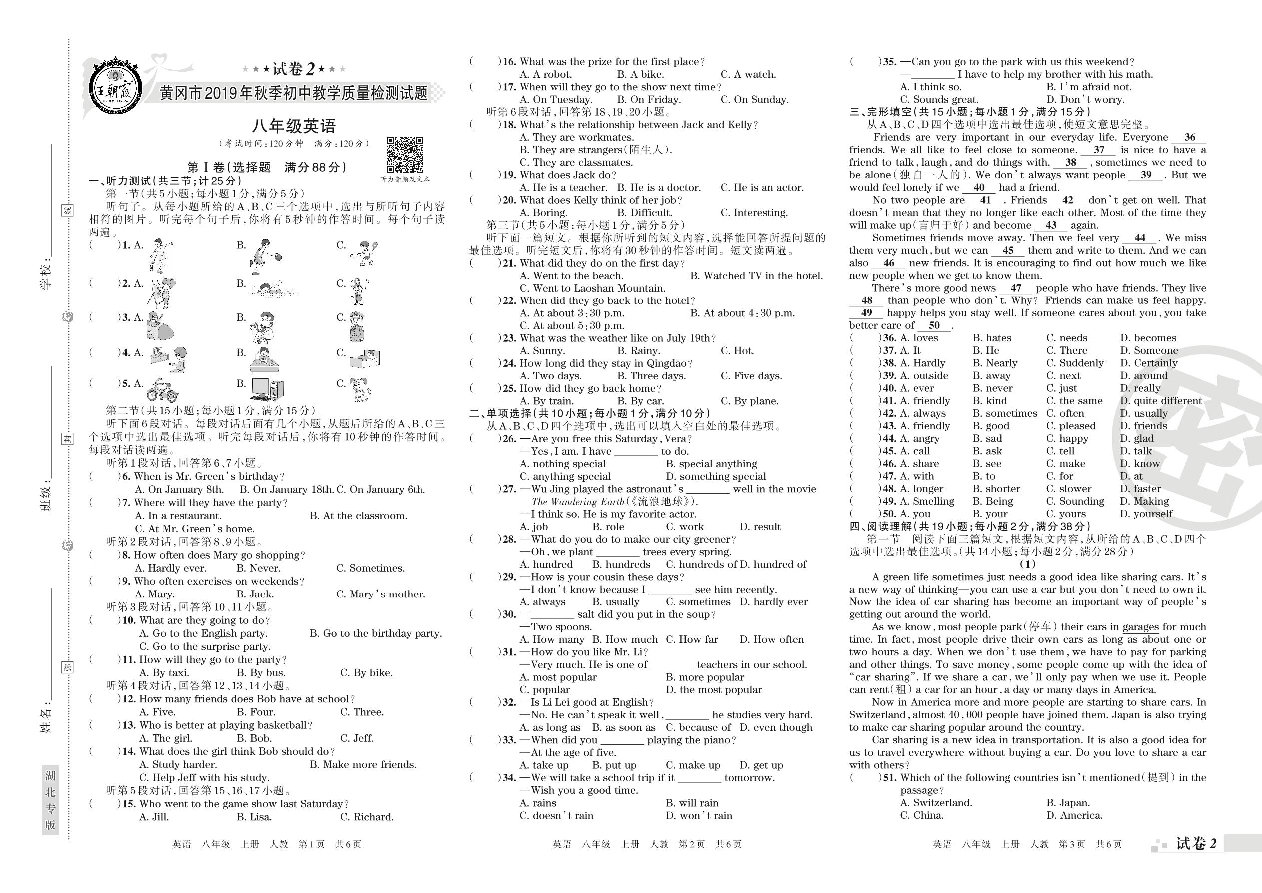 2019-2020学年第一学期黄冈市八年级英语试卷(人教版)【2】