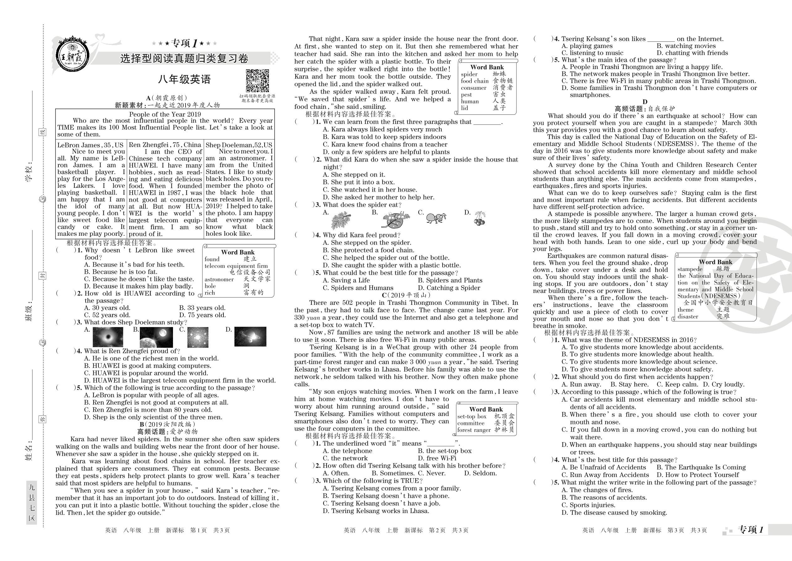 王朝霞期末专项卷——选择型阅读、任务型阅读真题归类复习八年级上册英语(新课版)_R21080994746【0】