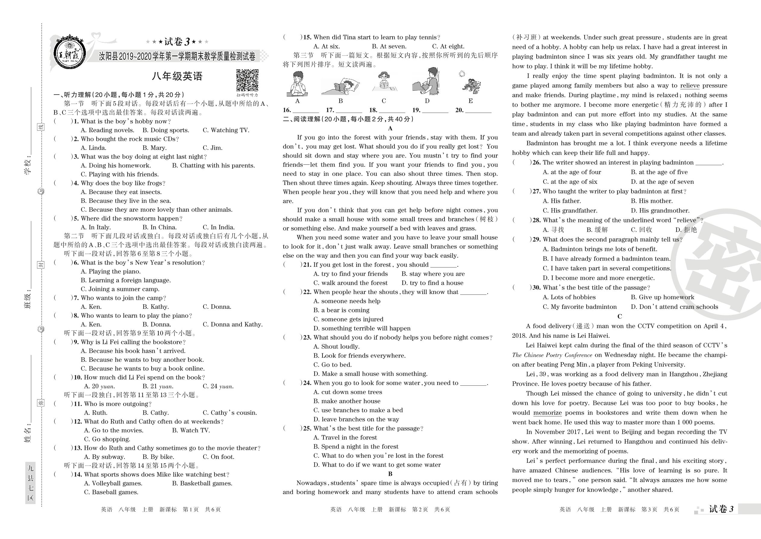 2019-2020学年第一学期洛阳市汝阳县八年级英语试卷(新课版)【3】