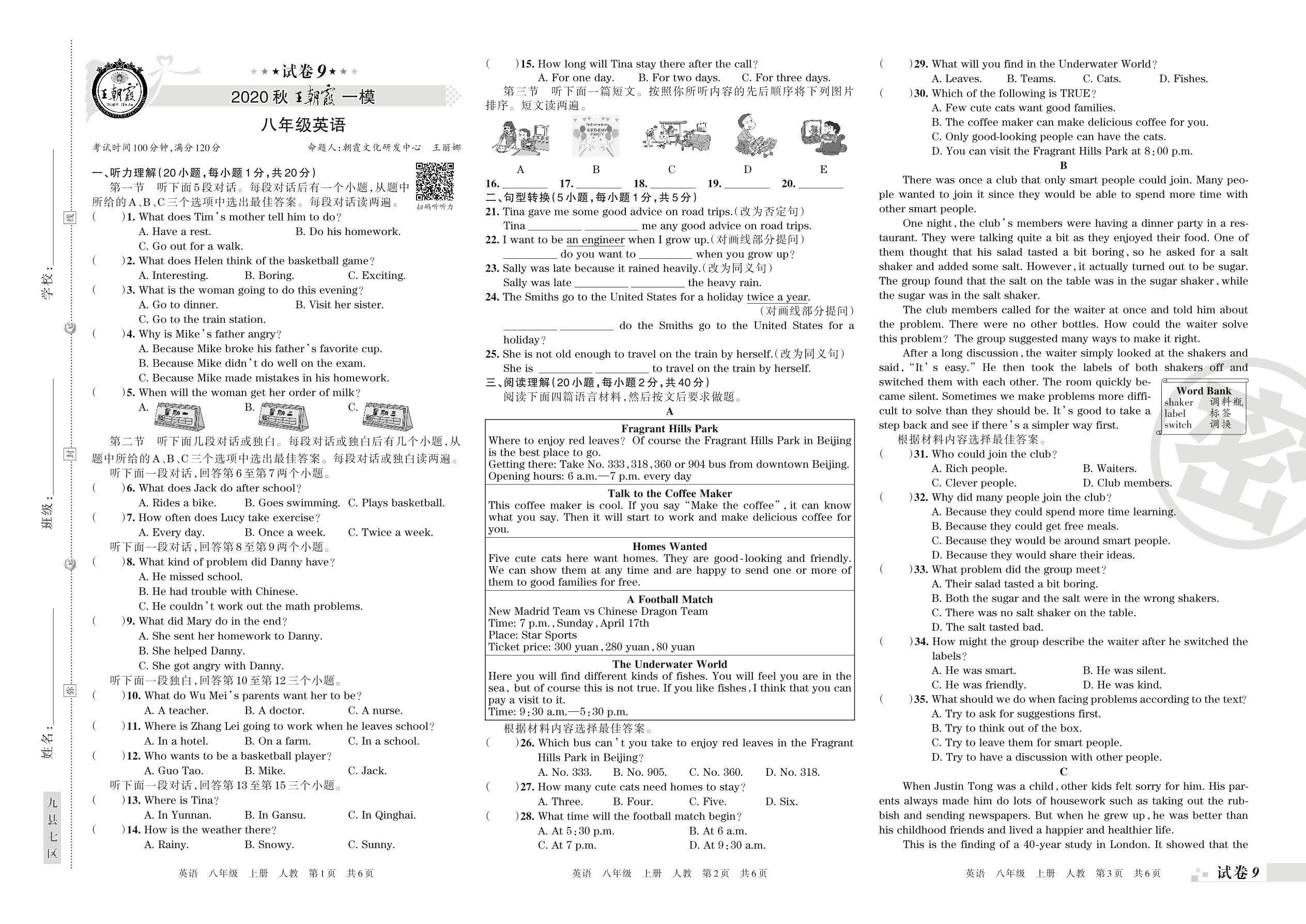 王朝霞期末模拟卷八年级上册英语(人教版)【9】