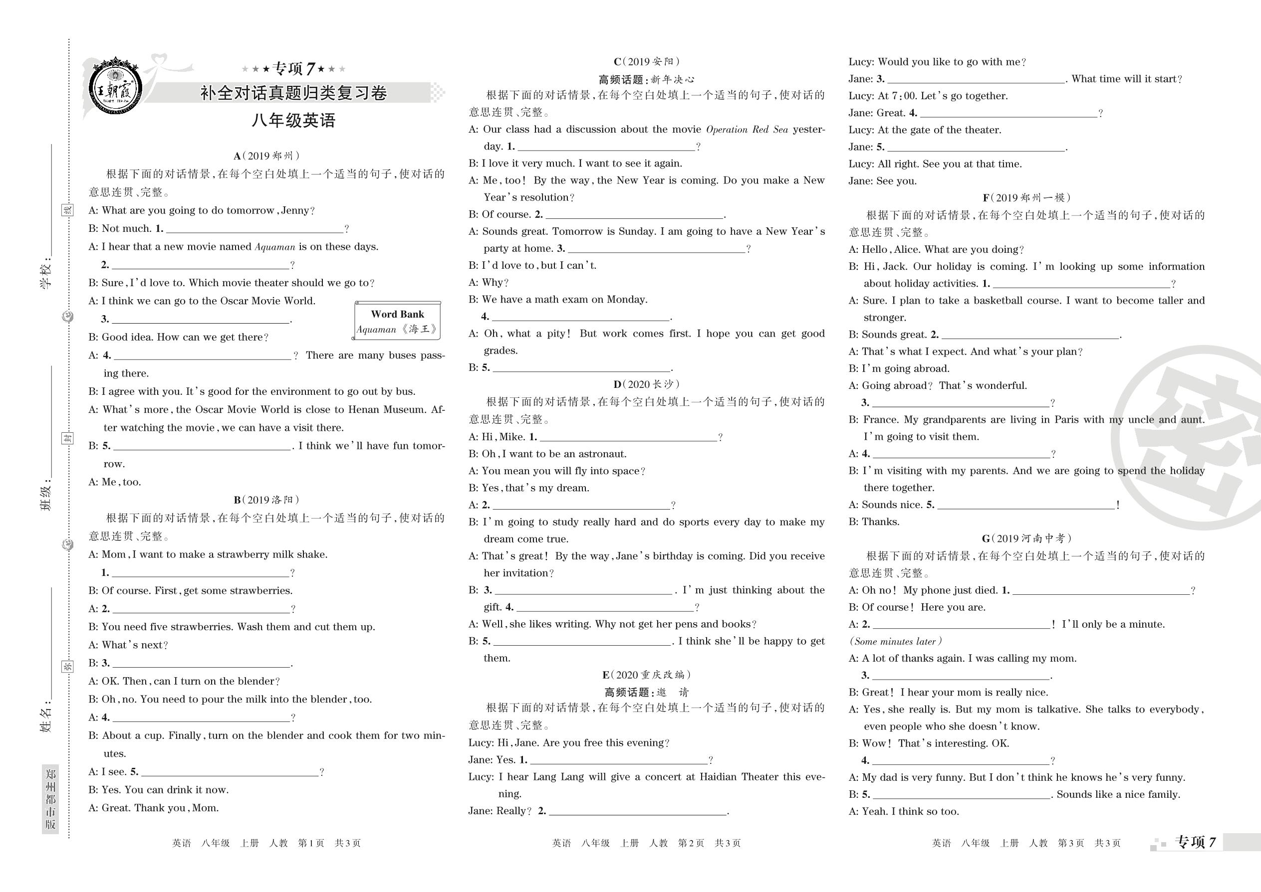 王朝霞期末专项卷——补全对话、书面表达真题归类复习八年级上册英语(人教版)_R21080995543【0】