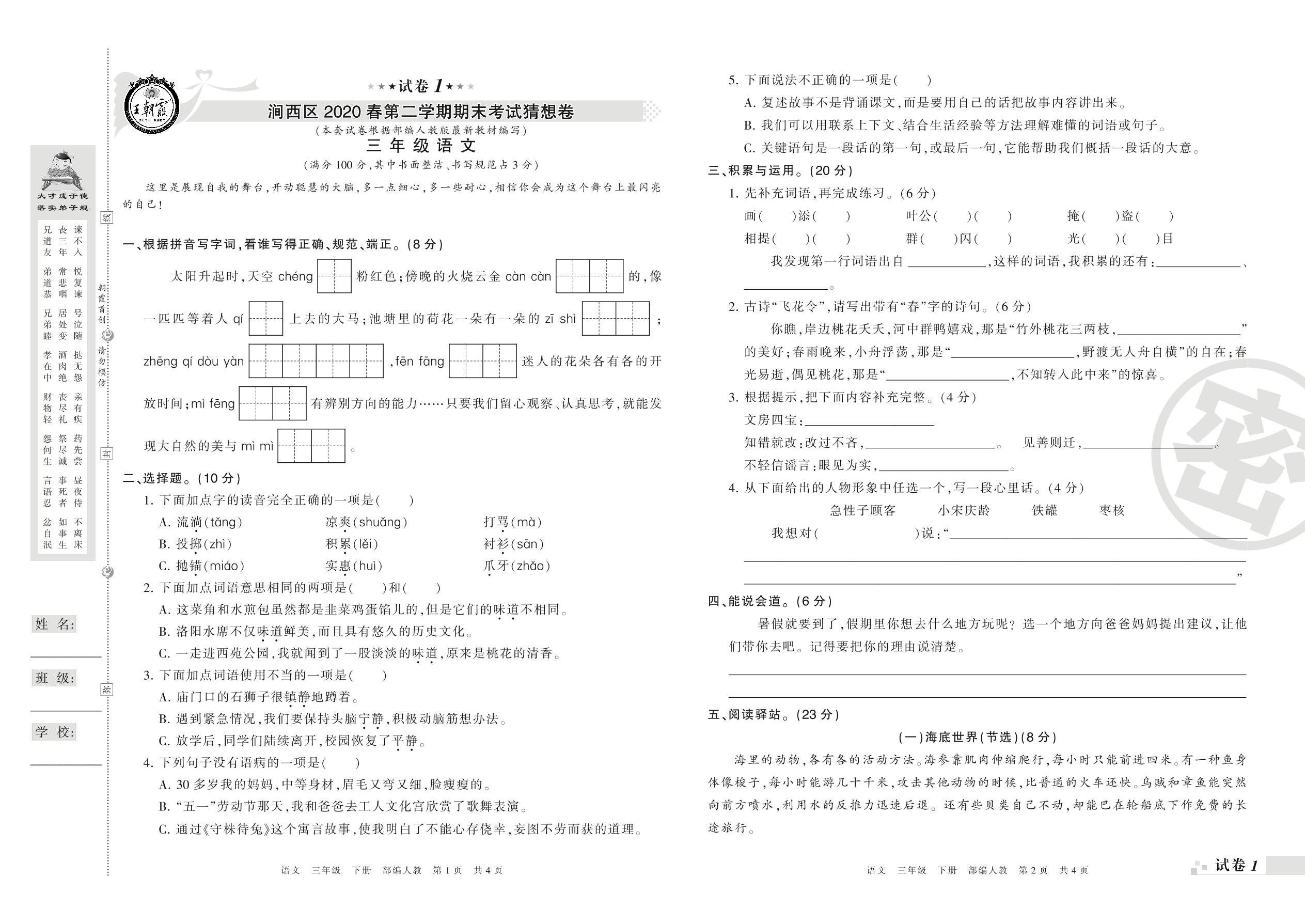 2018-2019学年第二学期洛阳市涧西区猜想卷三年级语文试卷(人教版)【1】