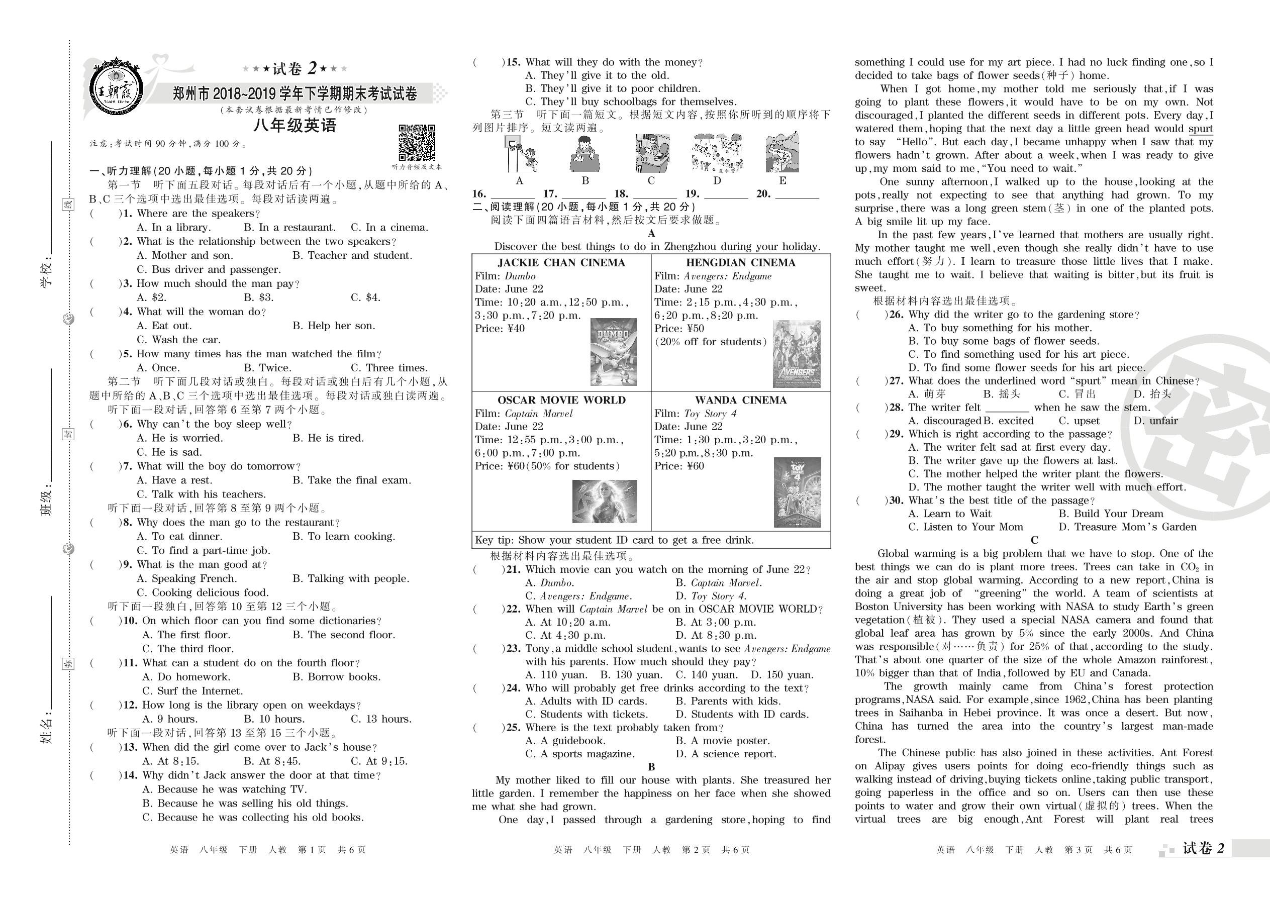 2018-2019学年第二学期郑州市八年级英语试卷(人教版)【2】