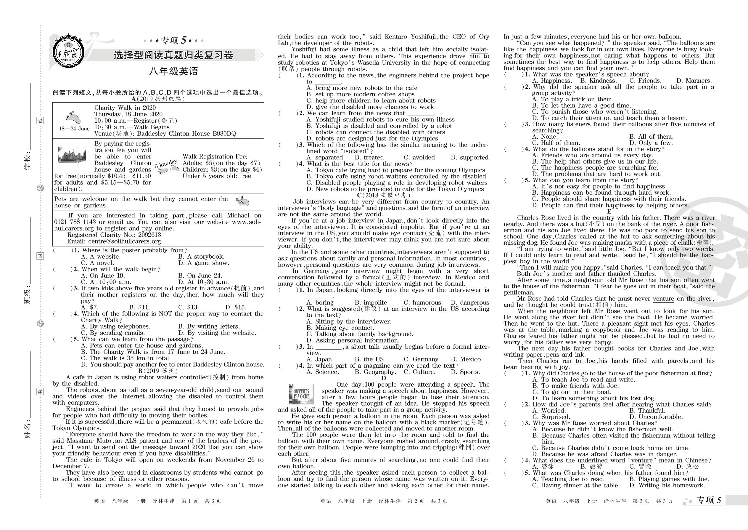 王朝霞期末专项卷——选择型阅读、任务型阅读真题归类复习卷八年级下册英语(译林版)_R210809100005【0】