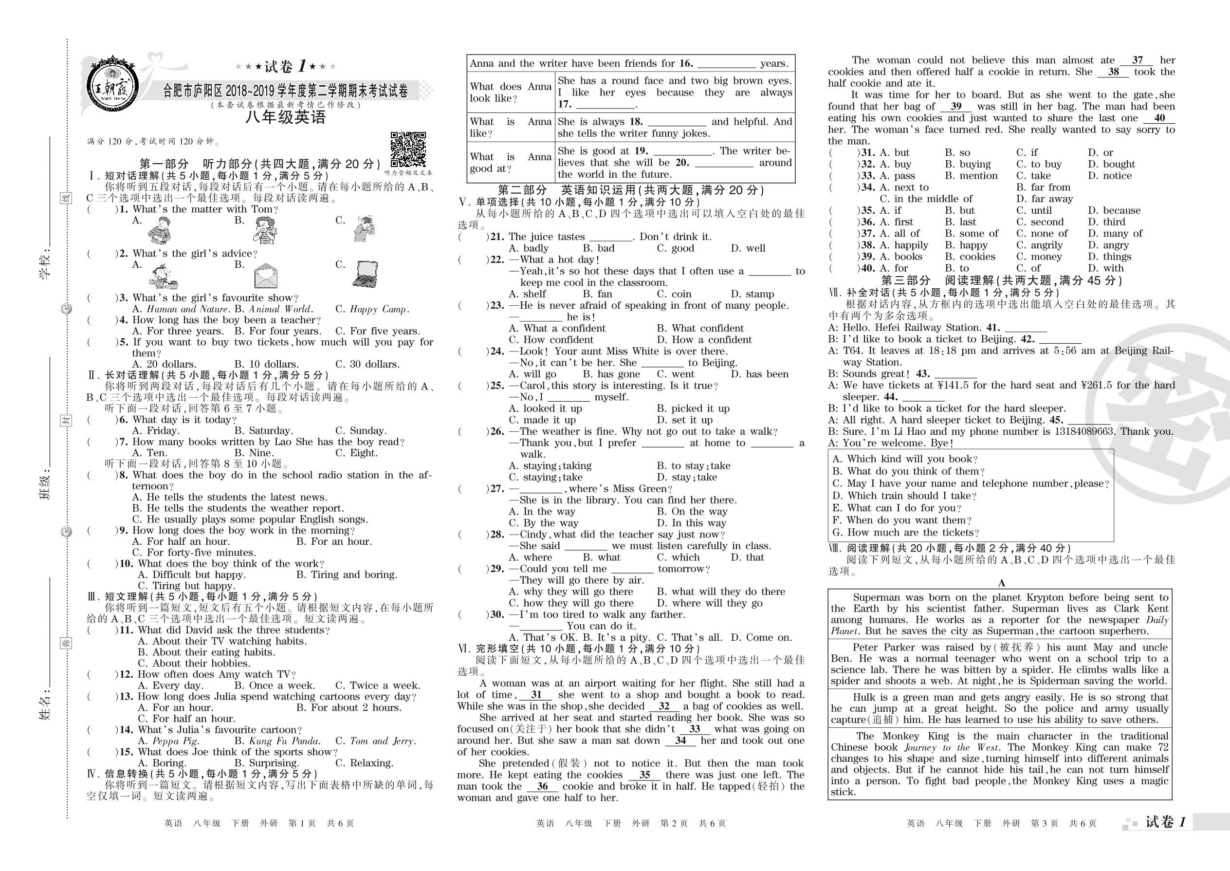 2018-2019学年第二学期合肥市庐阳区八年级英语试卷(外研版)【1】