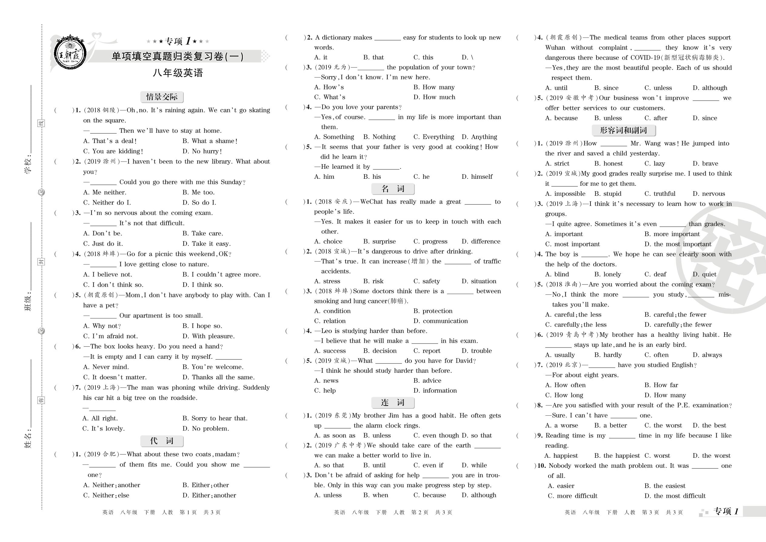王朝霞期末专项卷——单项填空(一)(二)真题归类复习卷八年级下册英语(人教版)_R210809100315【0】