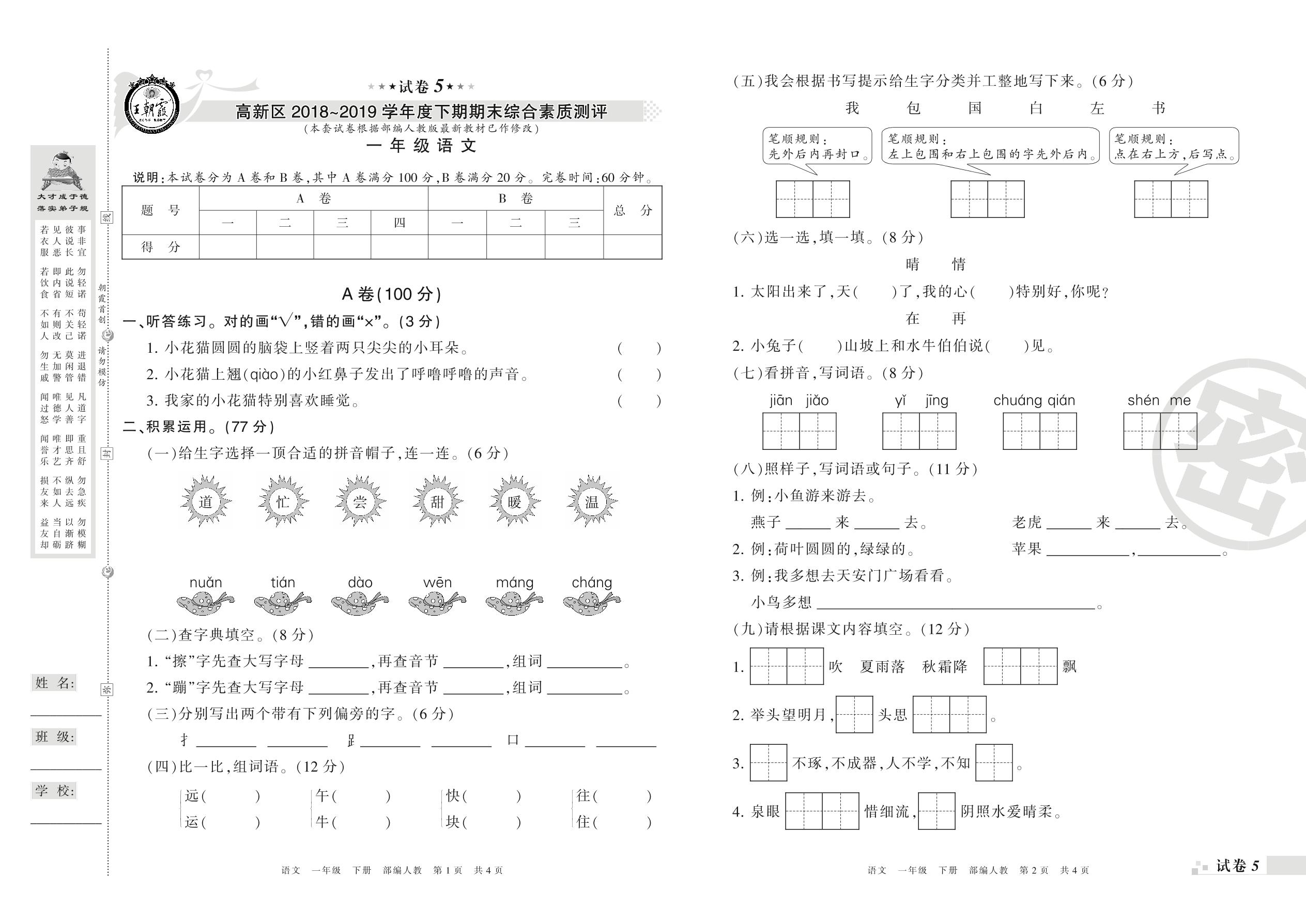 2018-2019学年第二学期成都市高新区一年级语文试卷(人教版)【5】
