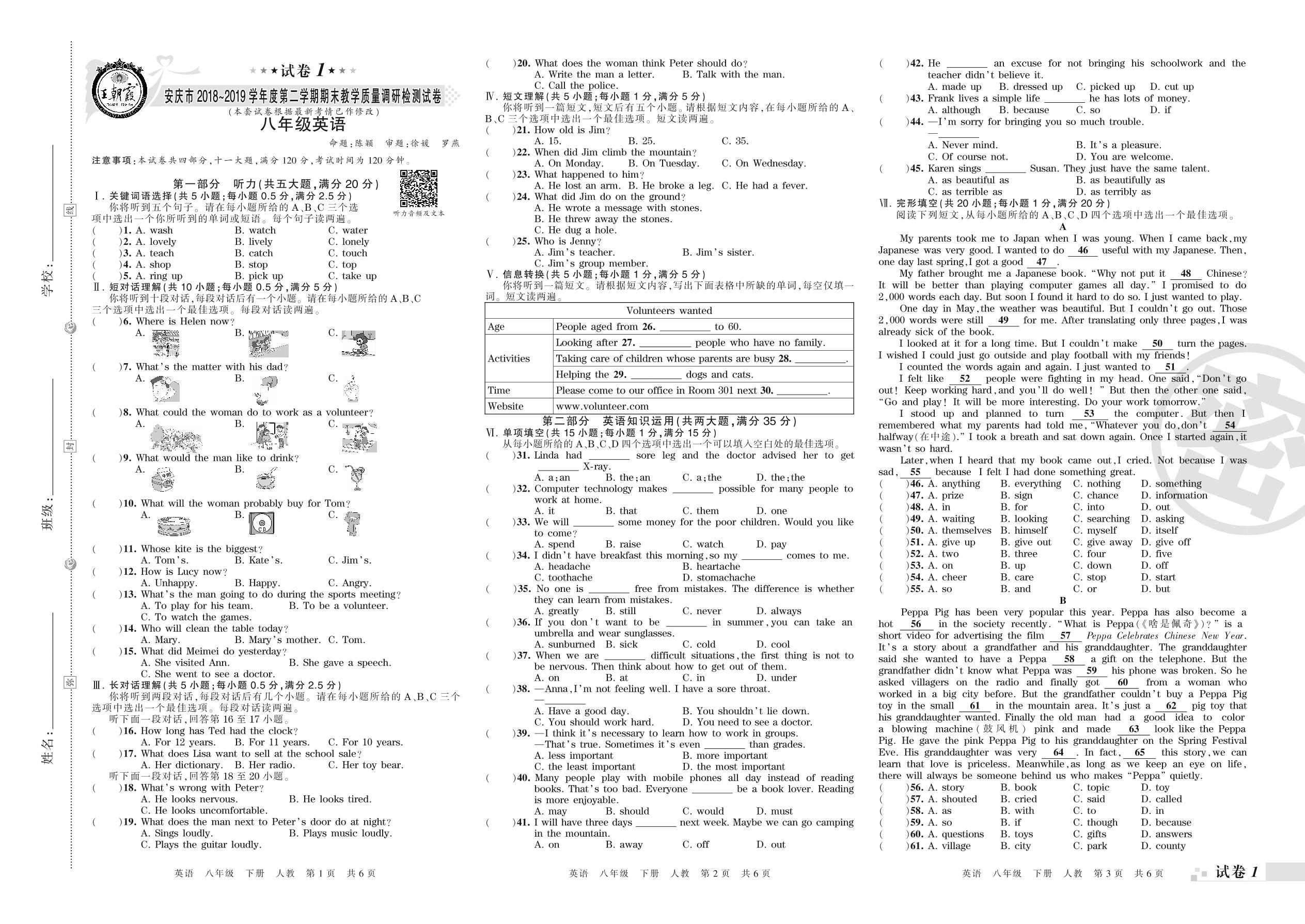 2018-2019学年第二学期安庆市八年级英语试卷(人教版)【1】