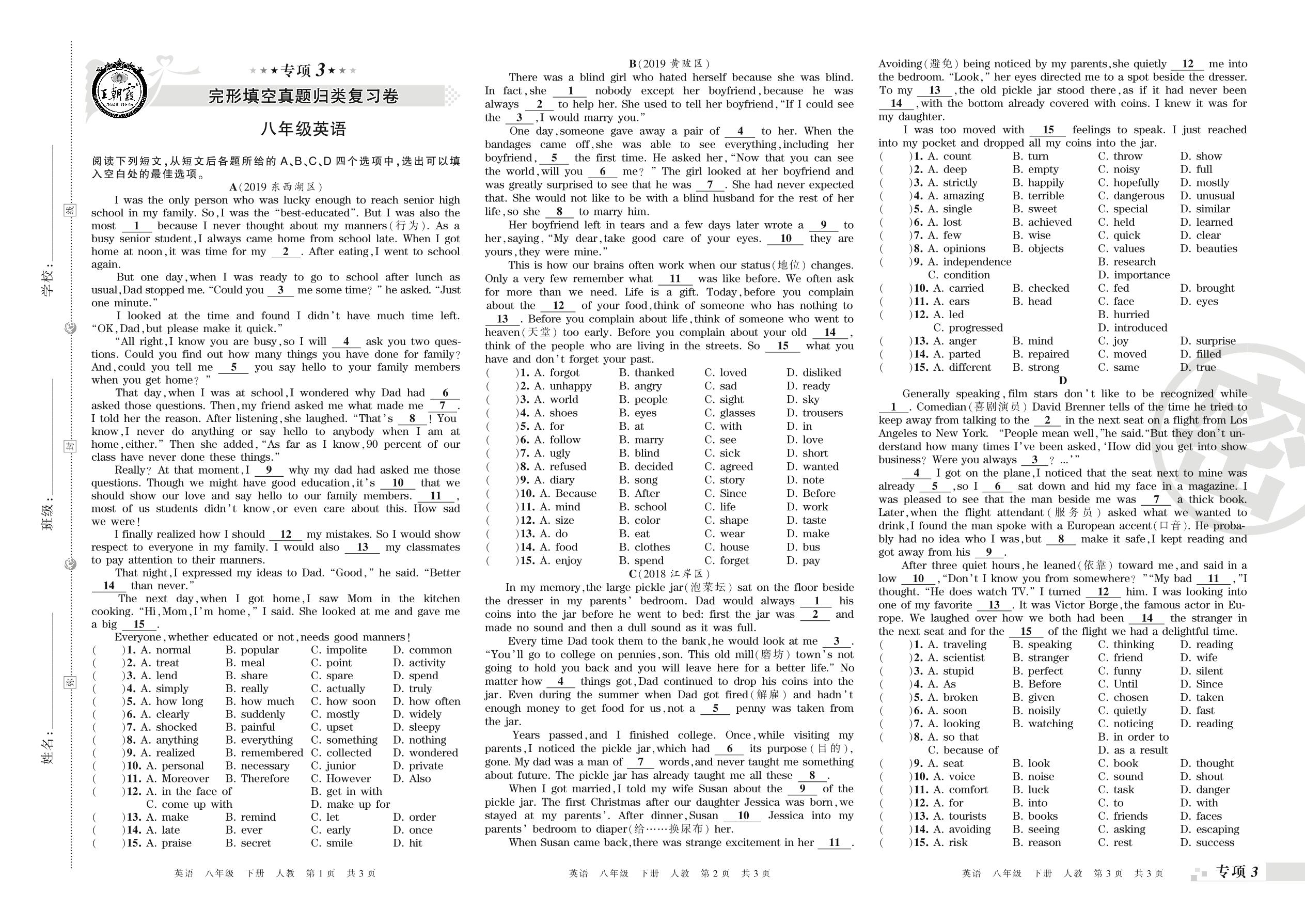 王朝霞期末专项卷——完形填空、阅读理解(一)真题归类复习卷八年级下册英语(人教版)_R210809100511【0】