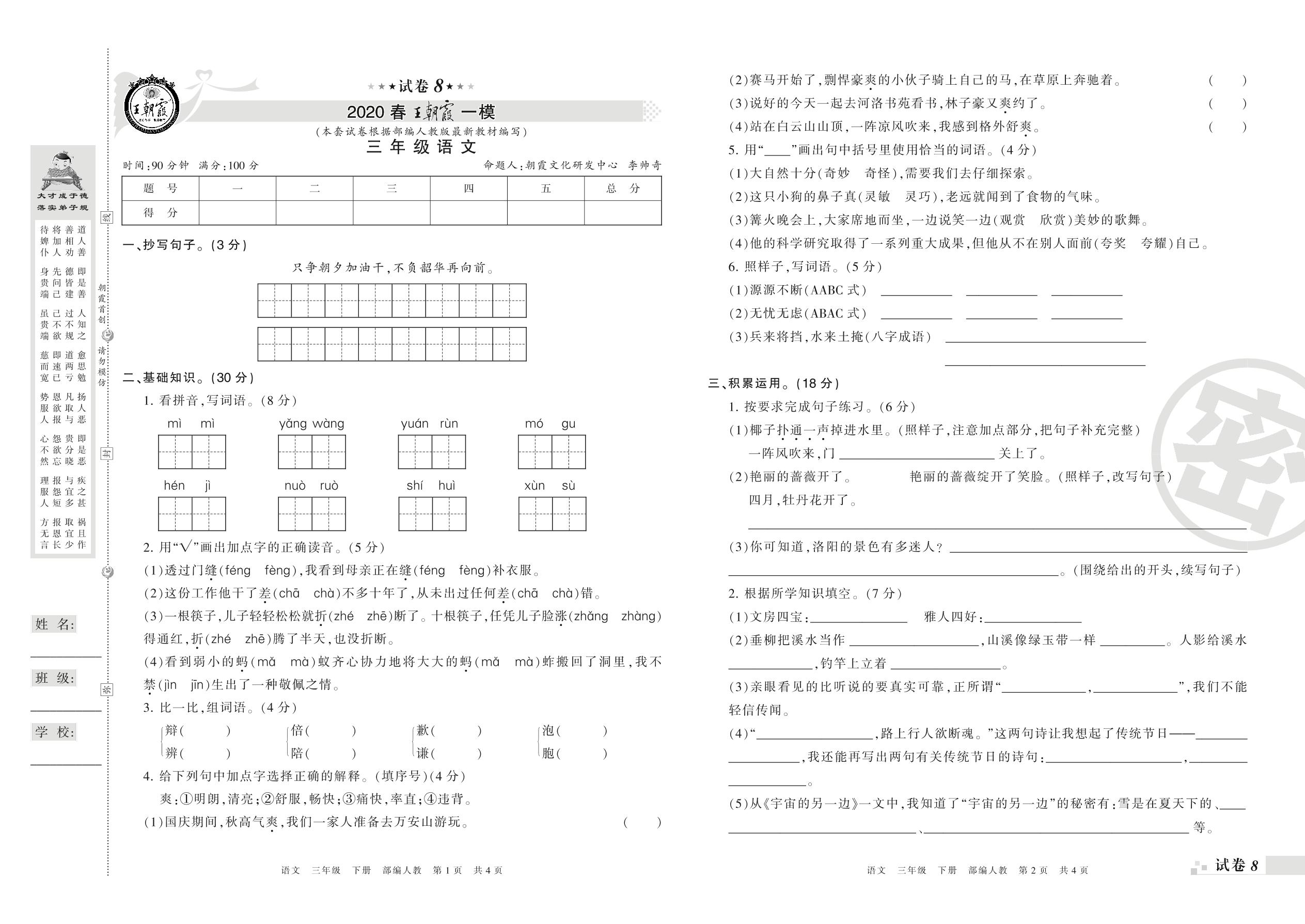 王朝霞期末模拟卷三年级下册语文(人教版)_R21080191123【8】