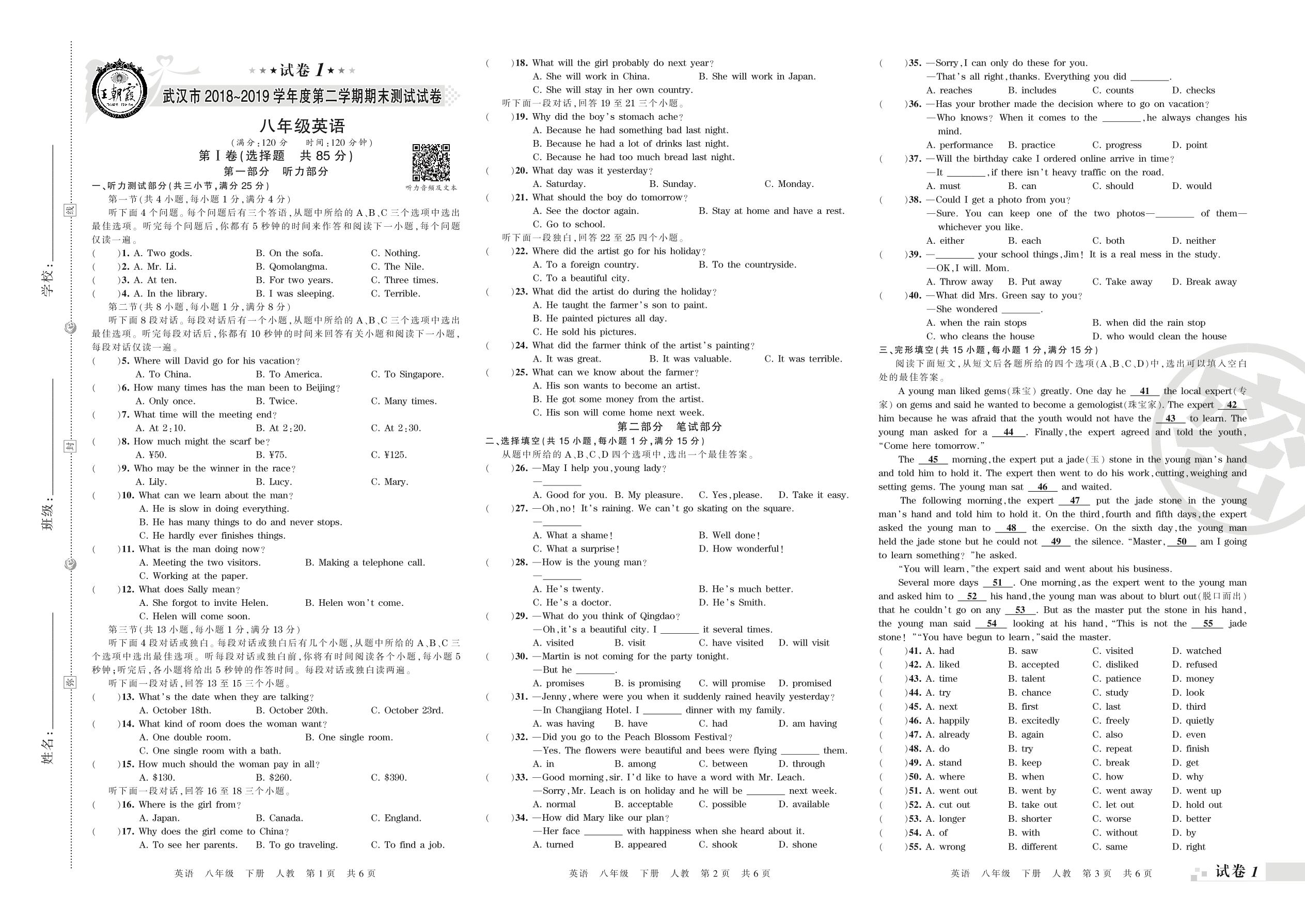 2018-2019学年第二学期武汉市八年级英语试卷(人教版)【1】