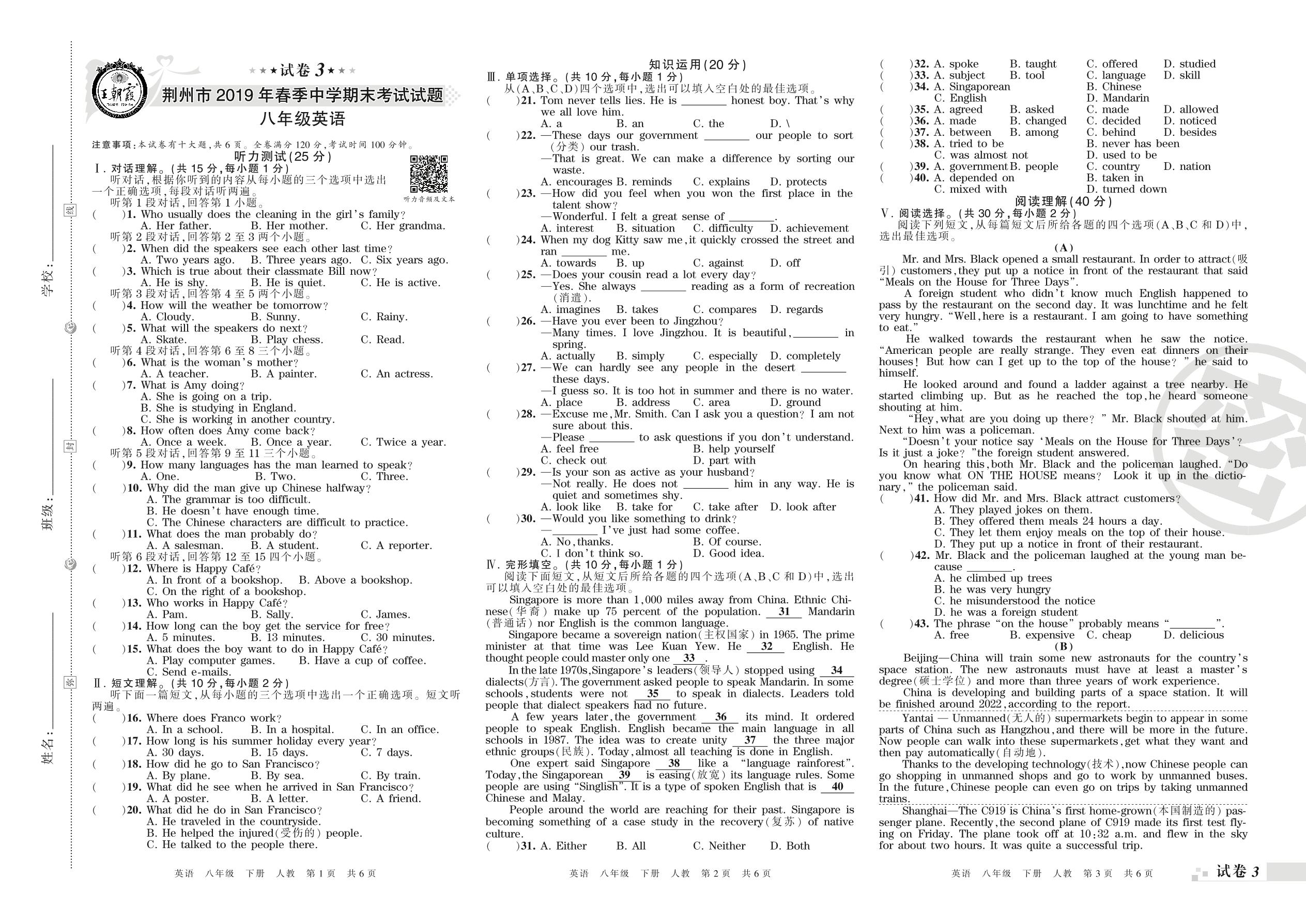 2018-2019学年第二学期荆州市八年级英语试卷(人教版)【3】