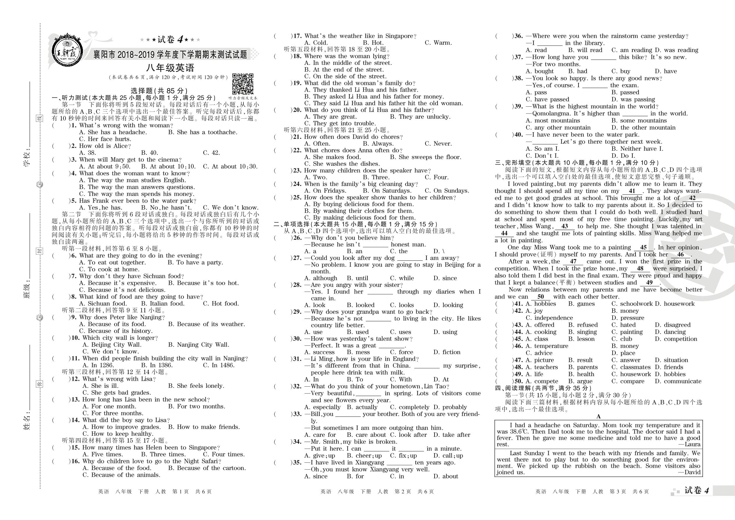 2018-2019学年第二学期襄阳市八年级英语试卷(人教版)【4】