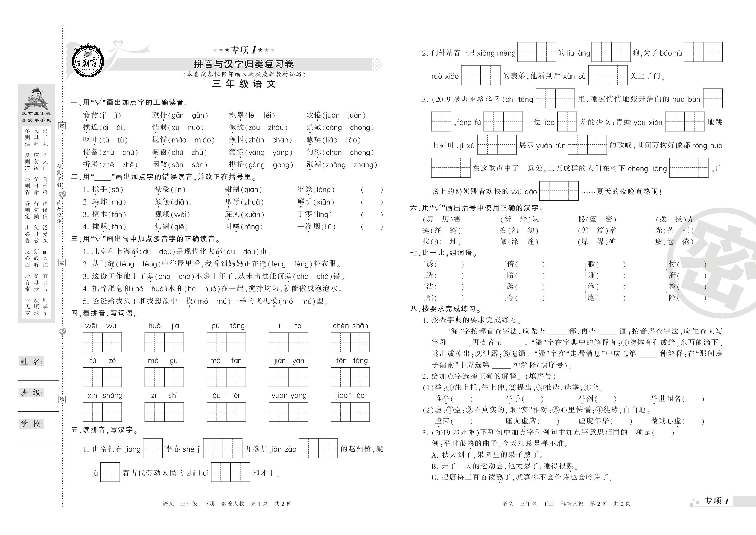 王朝霞期末专项卷——拼音与汉字、词语真题归类复习卷三年级下册语文(人教版)_R21080191149【0】