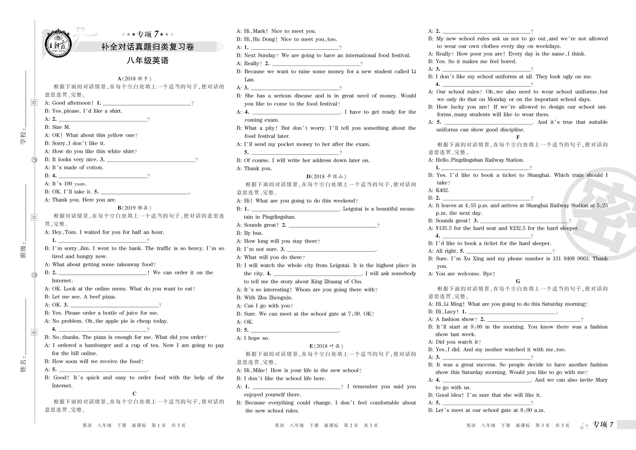 王朝霞期末专项卷——补全对话、书面表达真题归类复习卷八年级下册英语(新课版)_R210809102232【0】