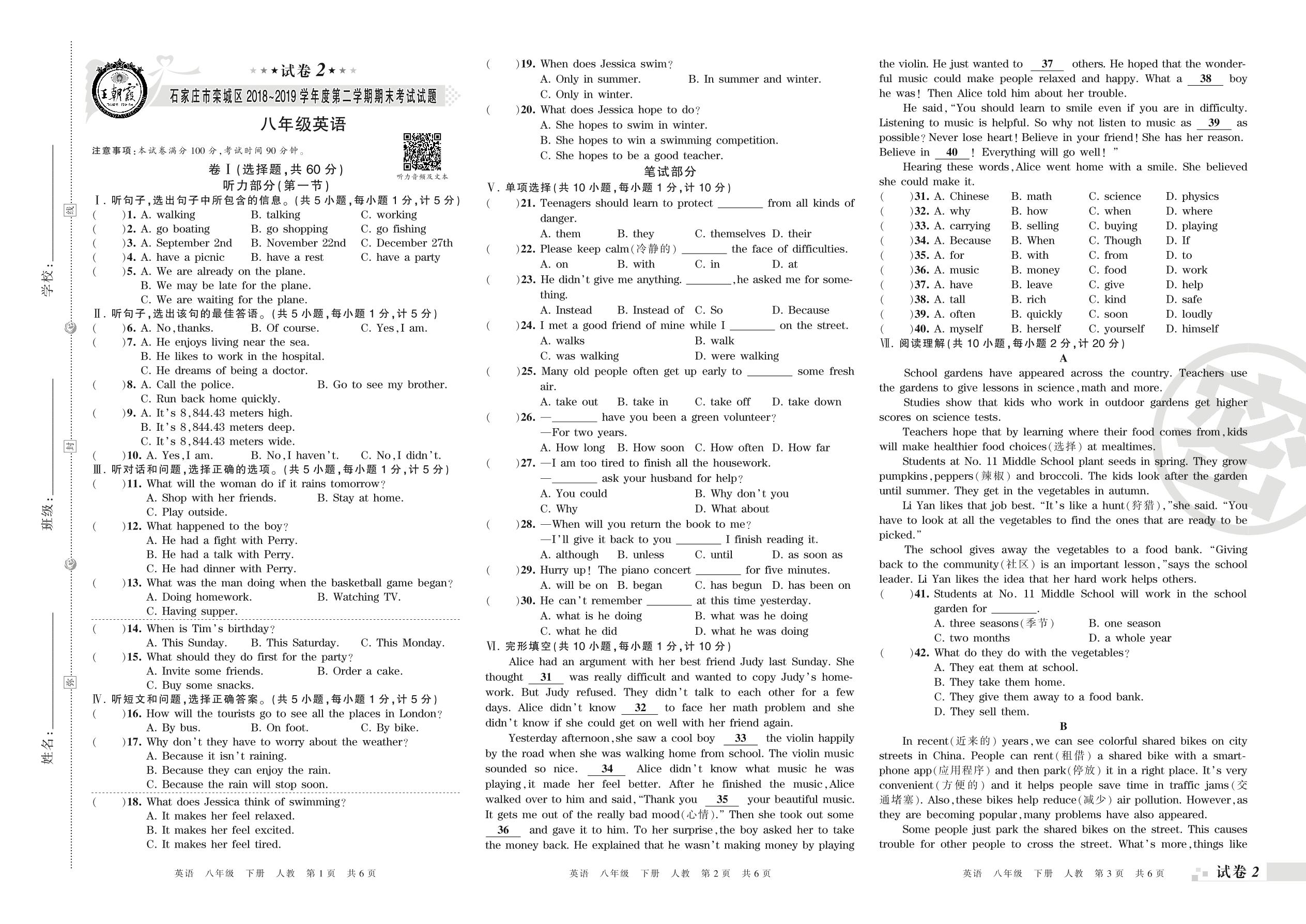 2018-2019学年第二学期石家庄市栾城区八年级英语试卷(人教版)【2】