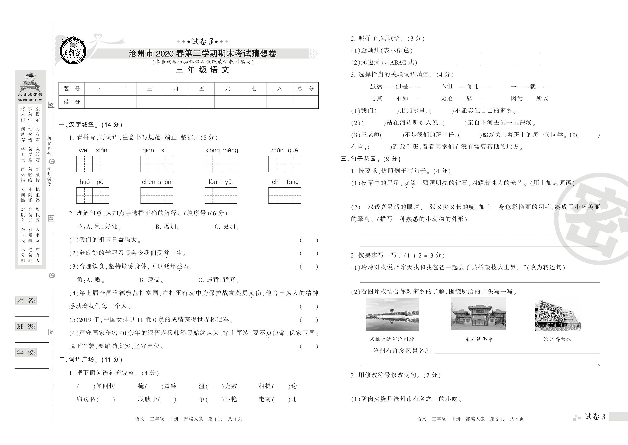 2018-2019学年第二学期沧州市猜想卷三年级语文试卷(人教版)【3】