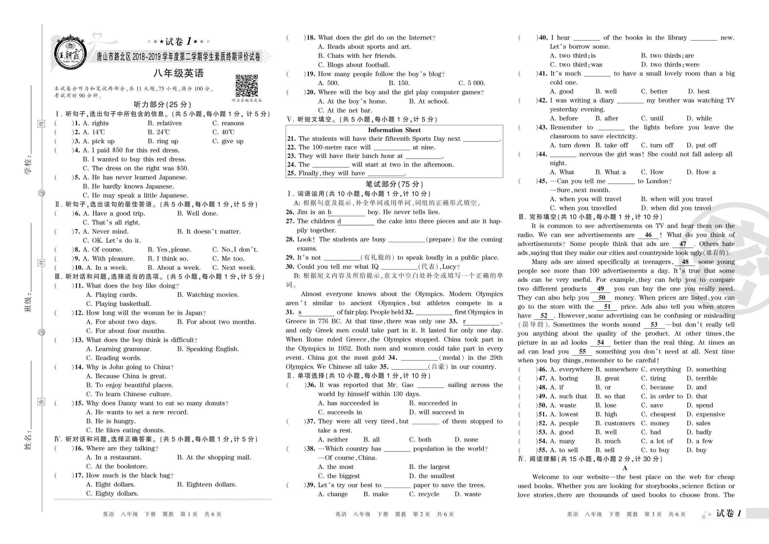2018-2019学年第二学期唐山市路北区八年级英语试卷(冀教版)【1】