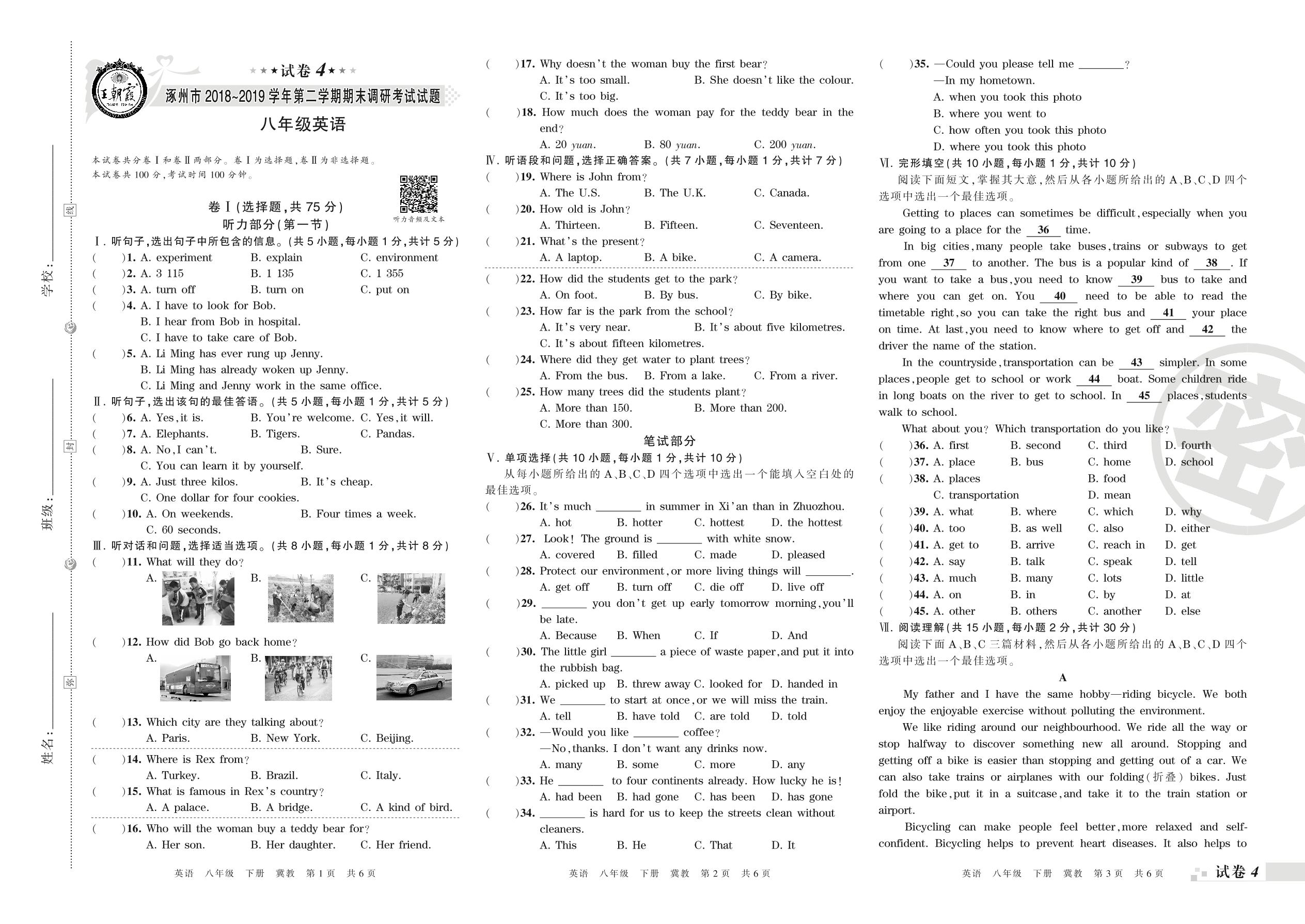 2018-2019学年第二学期涿州市八年级英语试卷(冀教版)【4】