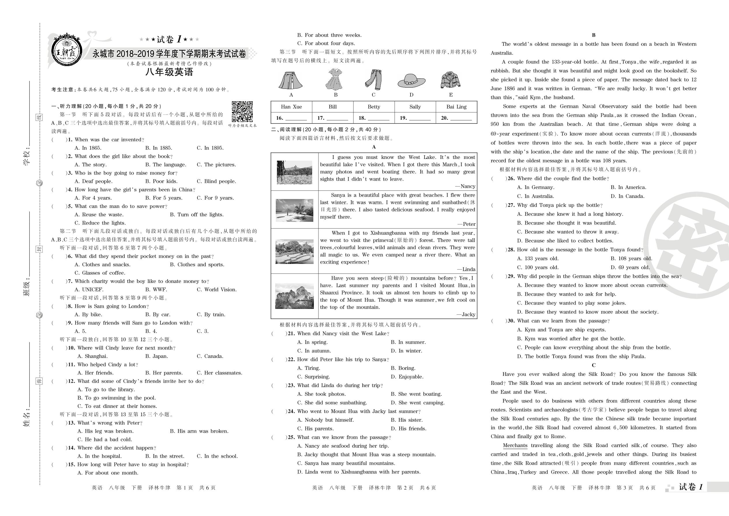 2018-2019学年第二学期永城市八年级英语试卷(译林版)【1】