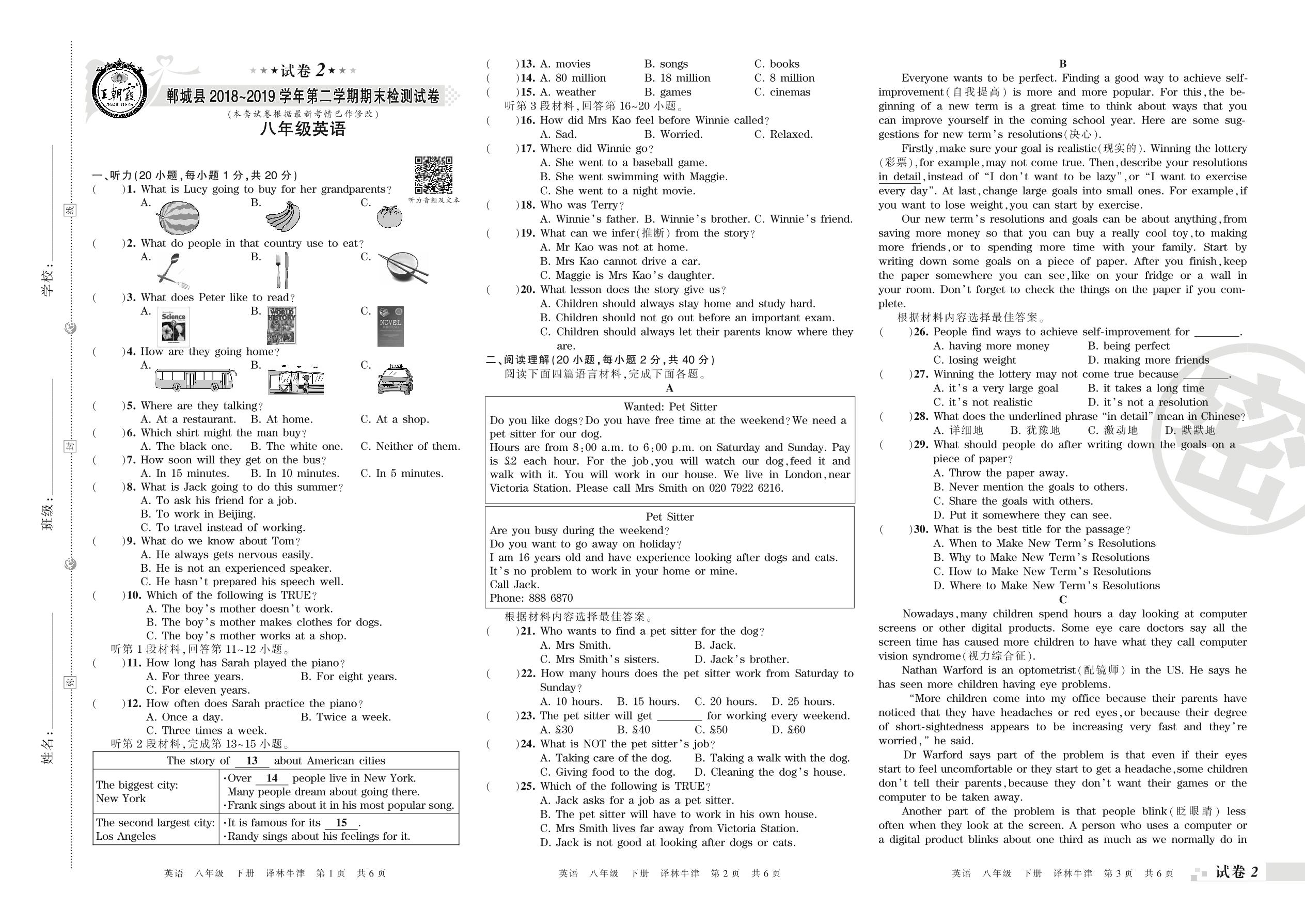 2018-2019学年第二学期周口市郸城县八年级英语试卷(译林版)【2】