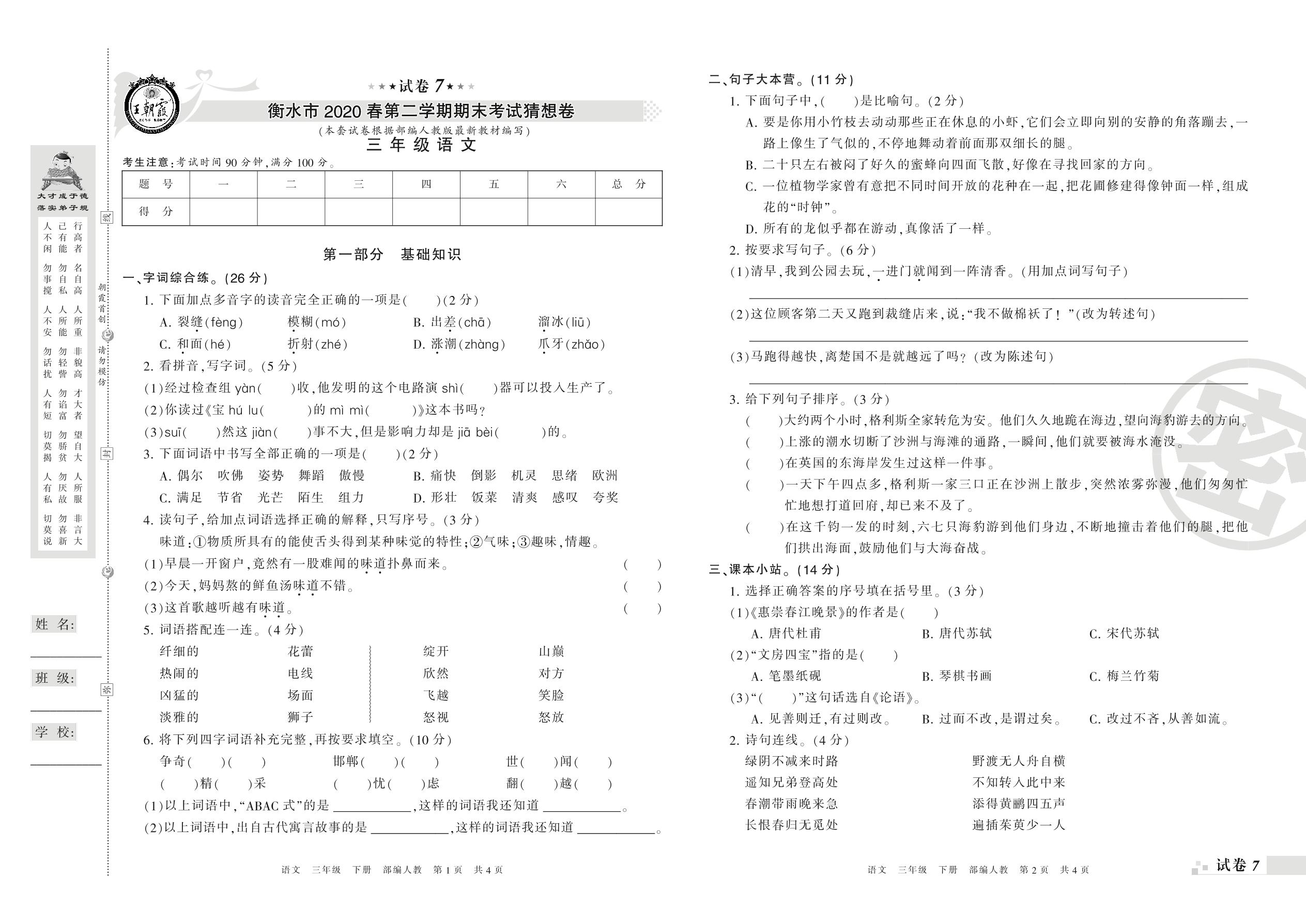 2018-2019学年第二学期衡水市猜想卷三年级语文试卷(人教版)【7】